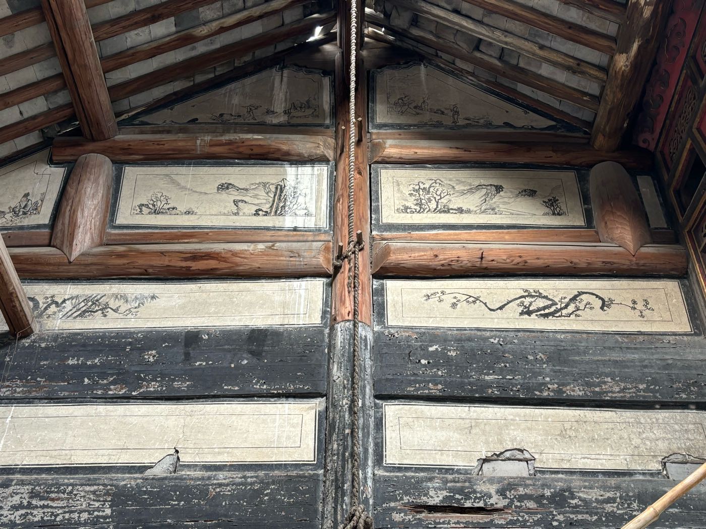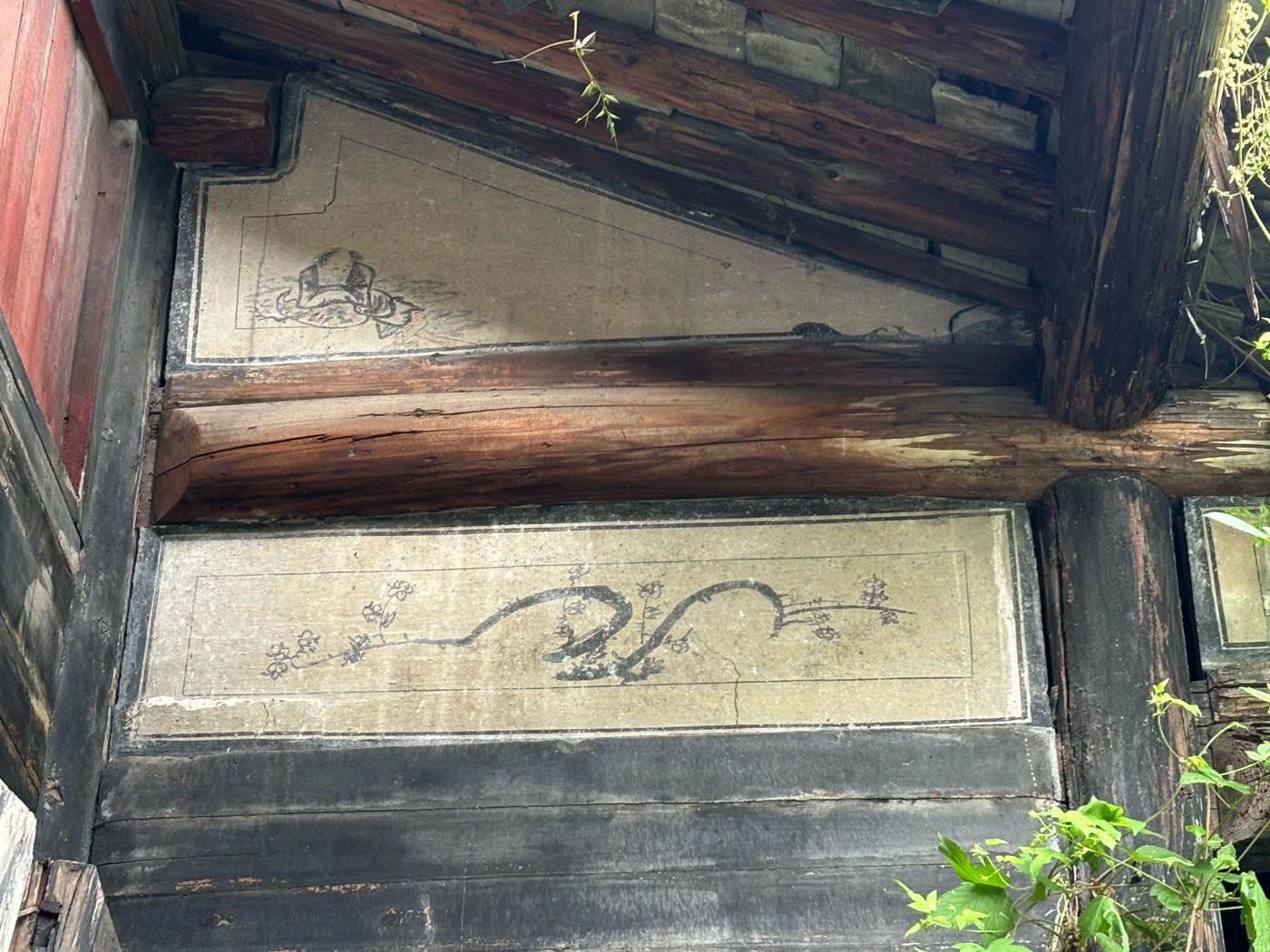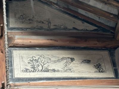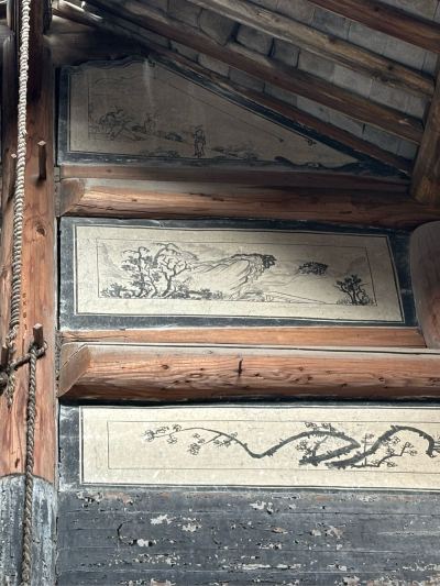 台门亮点:墙上壁画;厅堂神堂,神堂色彩(描金?),依然鲜艳。
