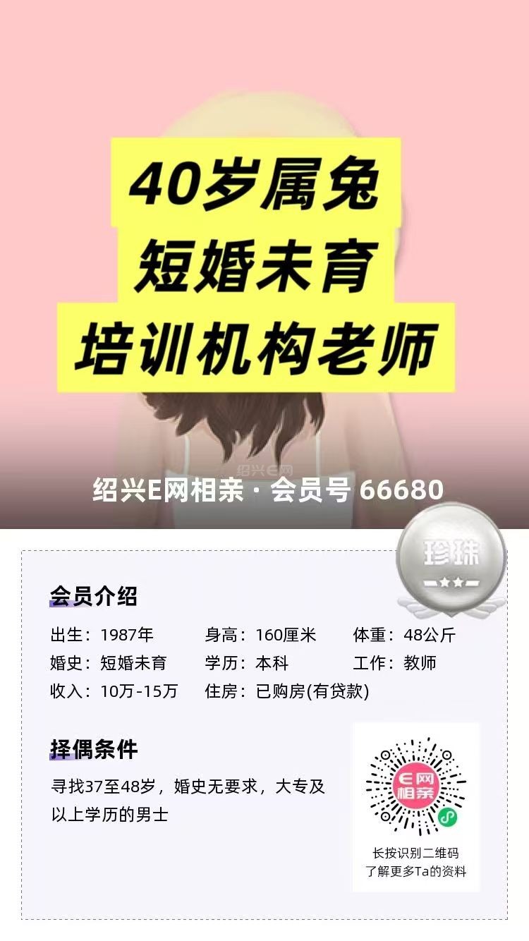 独生女,本科学历,正编教师,有房有车。为人和气、善良有爱心,爱好美食和健身。