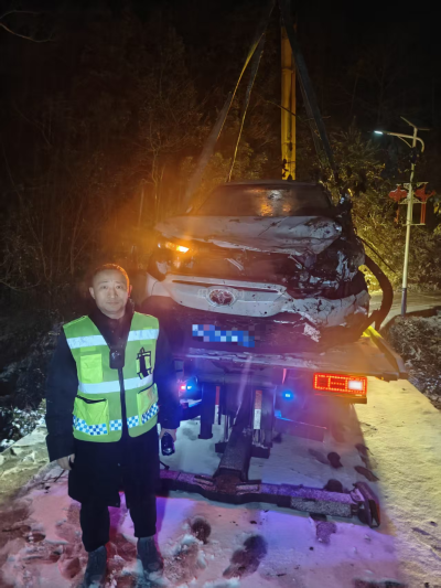 沟底的事故车辆损毁严重,车窗破碎、零件散落。王勇打开头灯,光束在车身上细致移动,俯身查勘每一处受损部位。“这里需要加固防护,吊车可以从东侧山体角度尝试起吊。”他与随后赶到的车商救援人员现场研判,快速敲定最佳救援方案。湿滑的沟底让吊车难以稳定锚定,王勇时而指挥调整起吊角度,时而俯身亲手固定绳索,凛冽寒风中,他的双手早已冻得通红发紫。经过3小时紧张作业,事故车辆成功被吊运至安全路面。