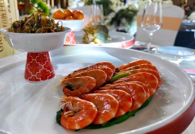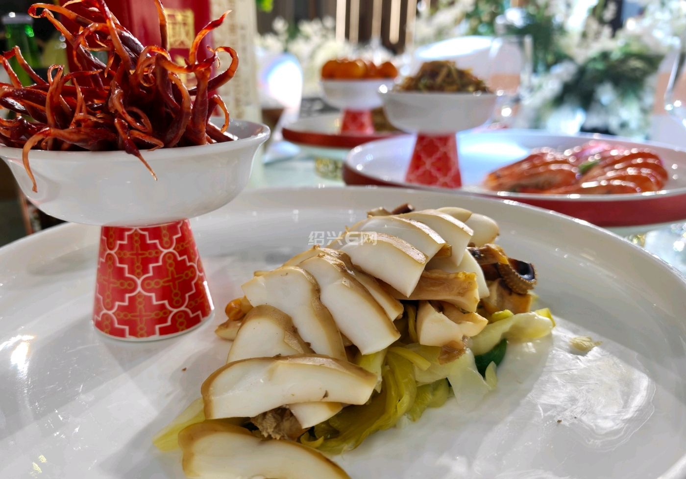 图一的白切鸡,一看就颜色百分之一百是预制菜。在绍兴居然有喜宴用对虾的,图二是对虾吧?