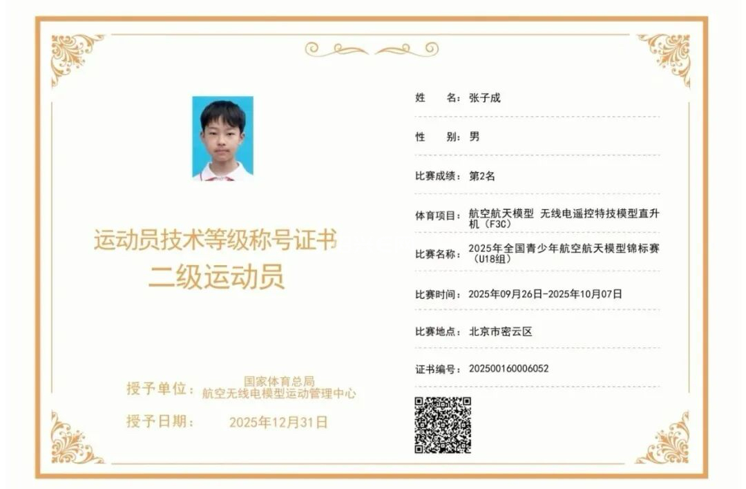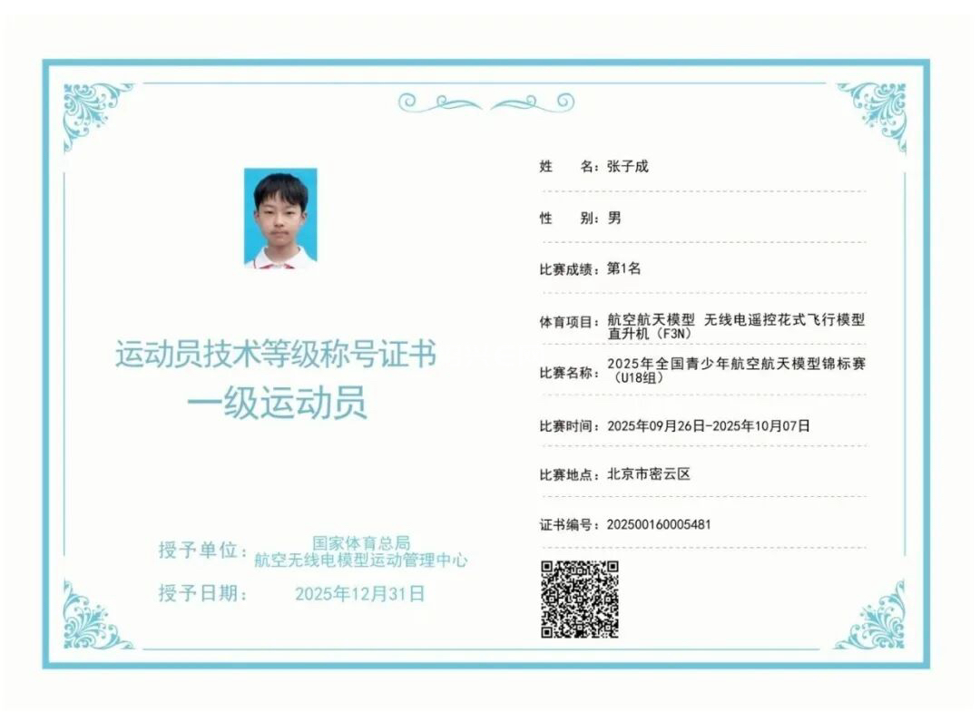 近日,国家体育总局授予浙江省绍兴市长城中学初二学生张子成“航空航天模型国家一级运动员”称号。这位16岁的少年,在2025年全国青少年航空航天模型锦标赛(U18组)中表现卓越,一举夺得无线电遥控花式飞行模型直升机(F3N)项目全国冠军,并荣获遥控特技模型直升机(F3C)项目全国亚军。