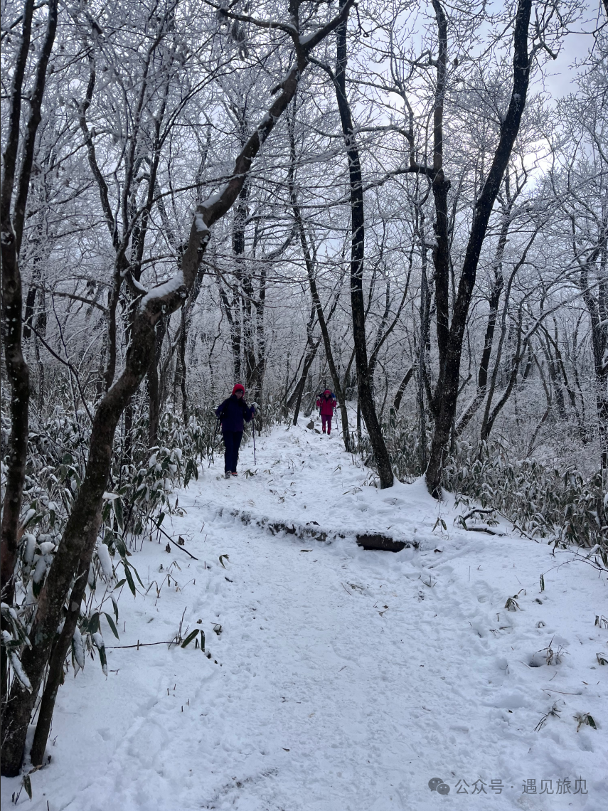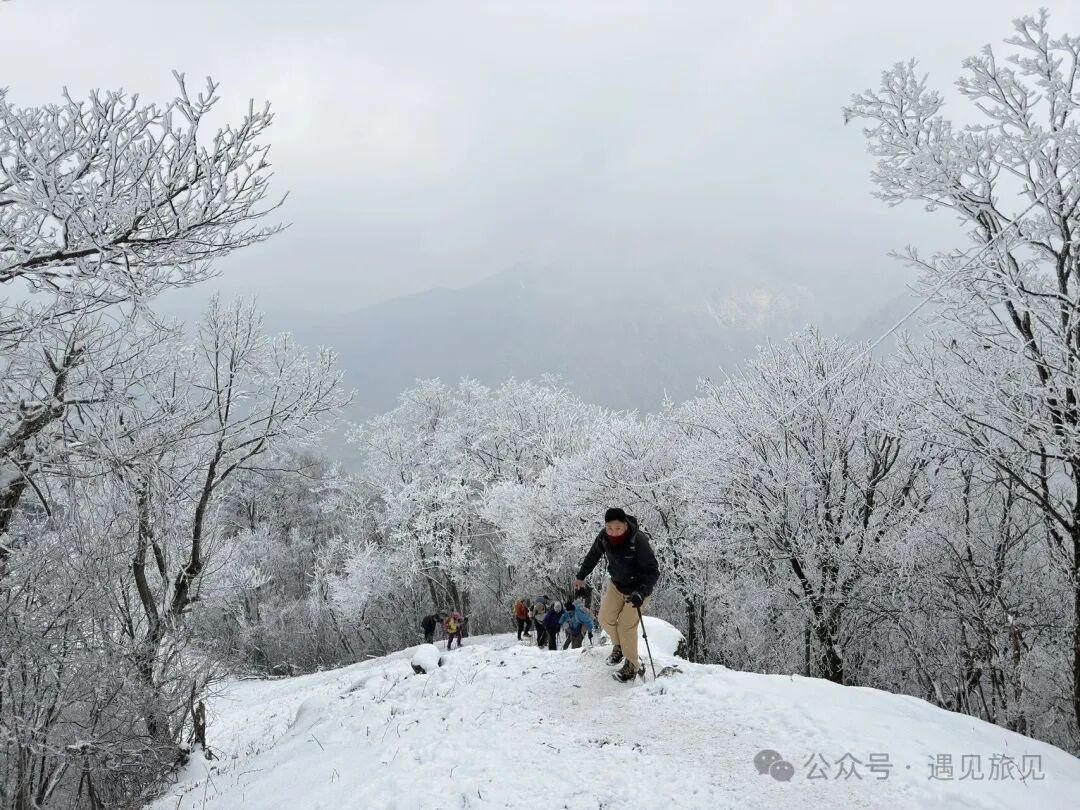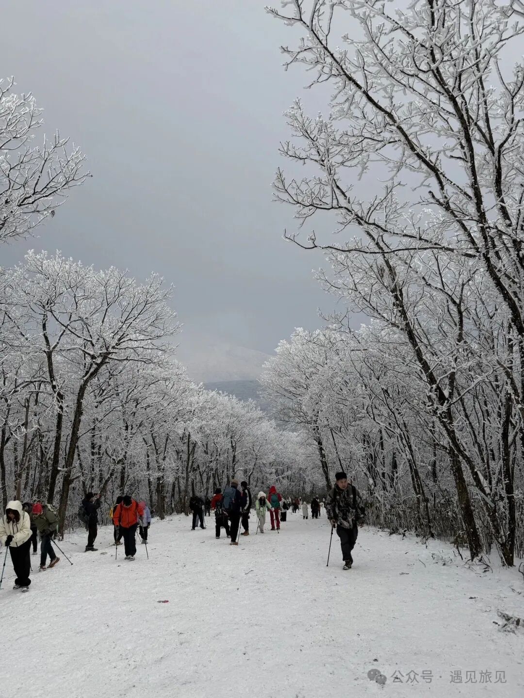 越近山顶,雪越厚,树枝上的雾淞更加挂满晶莹剔透。