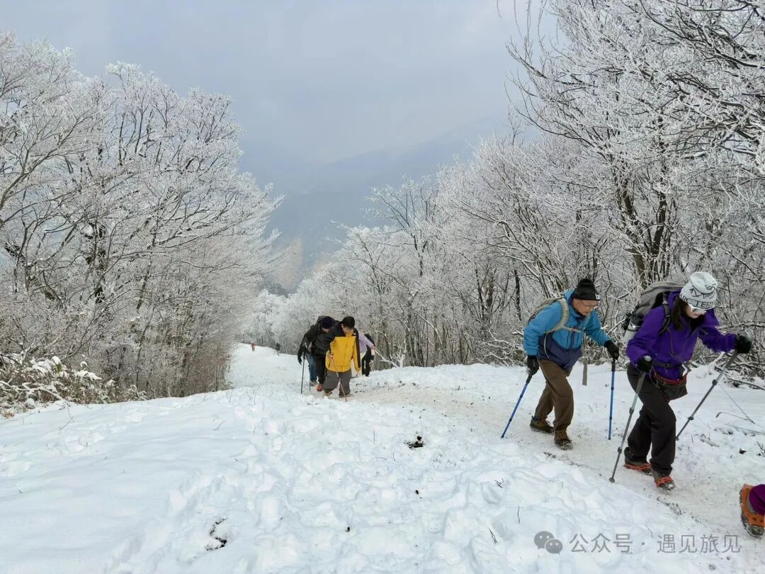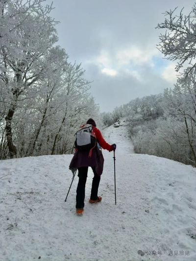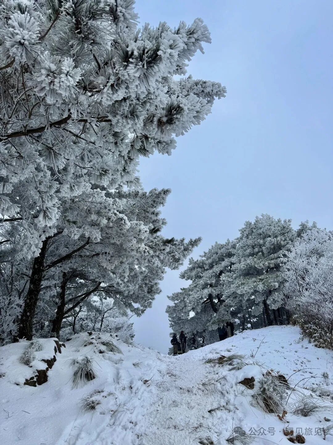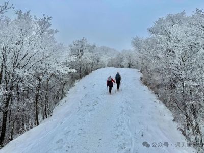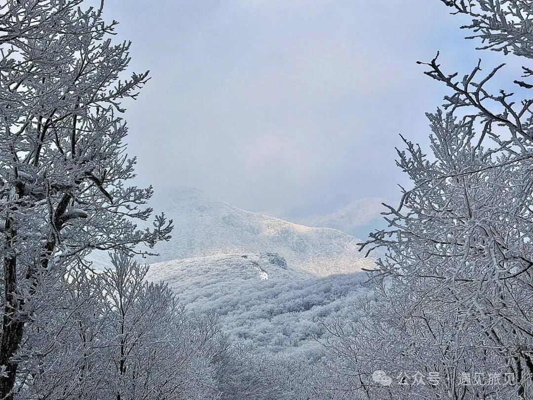 越近山顶,雪越厚,树枝上的雾淞更加挂满晶莹剔透。