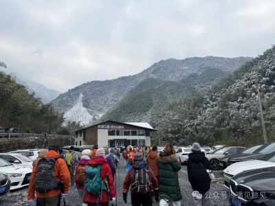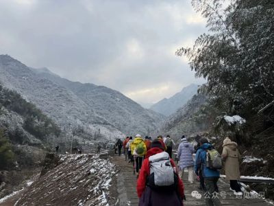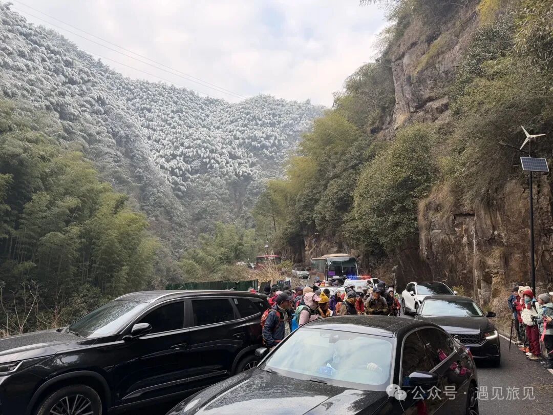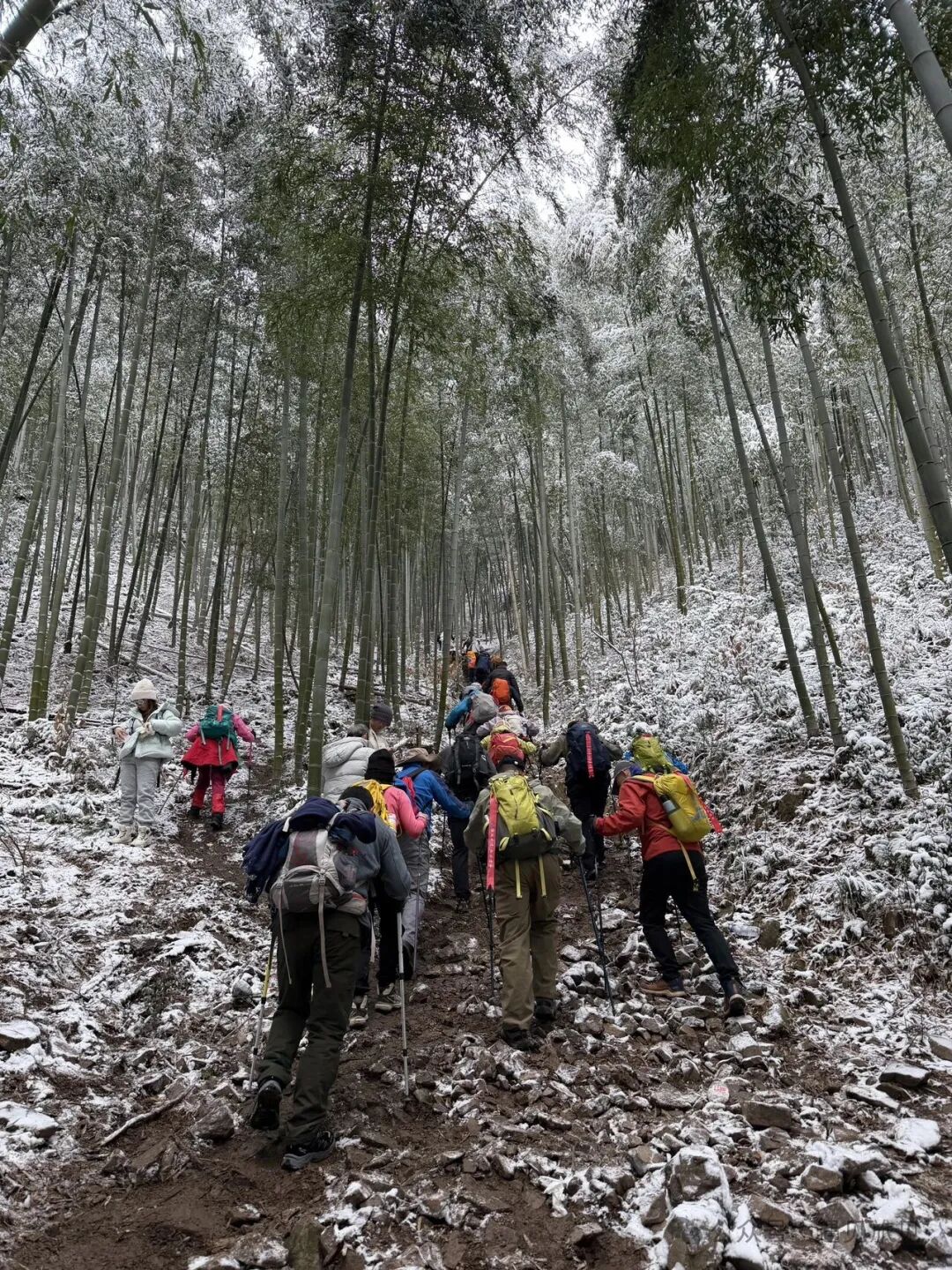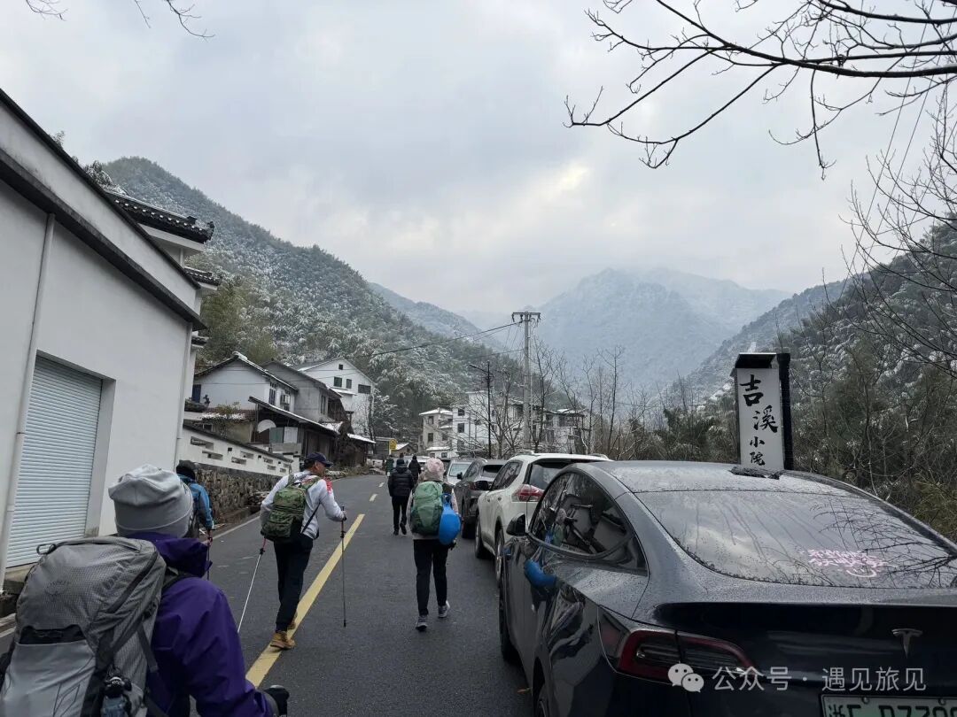 2026年的第一页日历轻轻翻开,浙江就飘起了雪,风闻群山染素白,龙王山尤甚,千山群东风组织了这活动,早上五点四十从绍兴出发,一行68人分两车,上午九点到达章村镇长潭村,未达黄浦江源头龙王山景区被前来登龙王山观雪的车流堵住,于是就地停车,开始徒步。