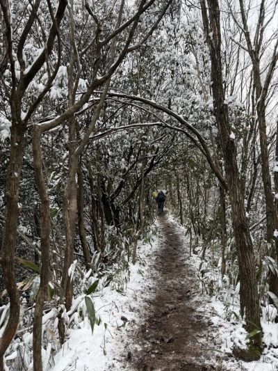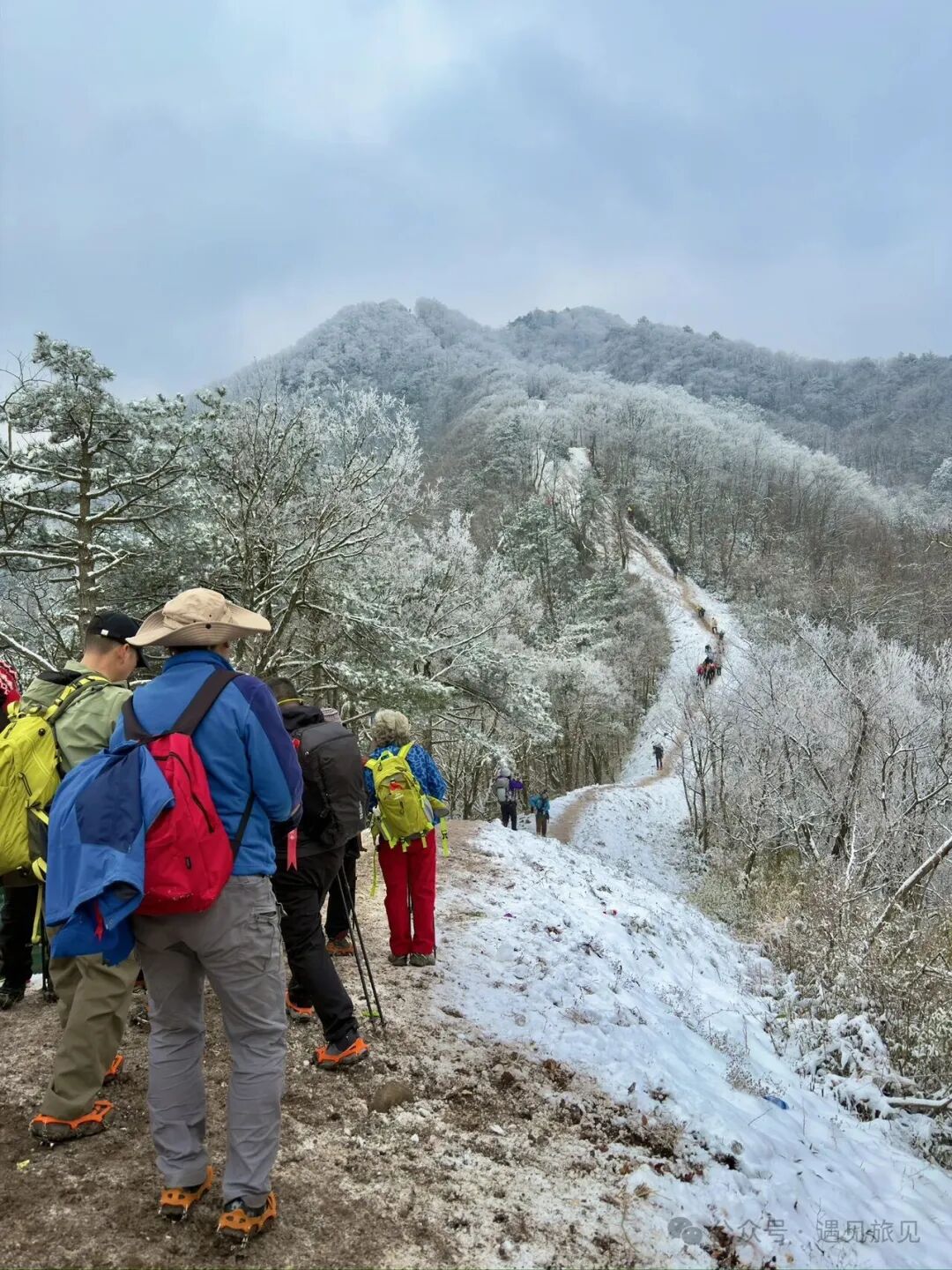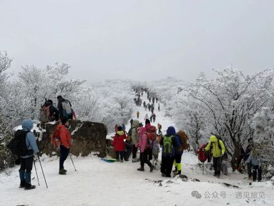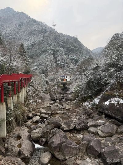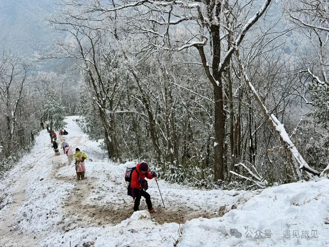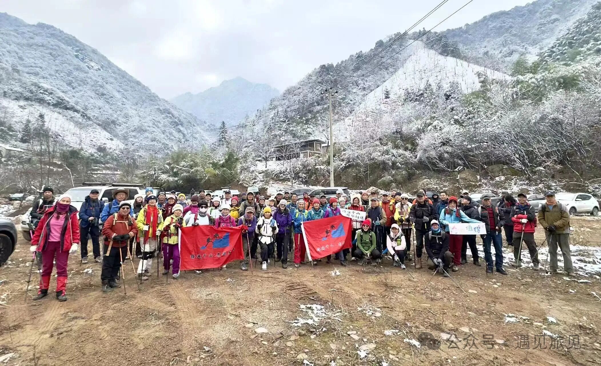 2026年的第一页日历轻轻翻开,浙江就飘起了雪,风闻群山染素白,龙王山尤甚,千山群东风组织了这活动,早上五点四十从绍兴出发,一行68人分两车,上午九点到达章村镇长潭村,未达黄浦江源头龙王山景区被前来登龙王山观雪的车流堵住,于是就地停车,开始徒步。