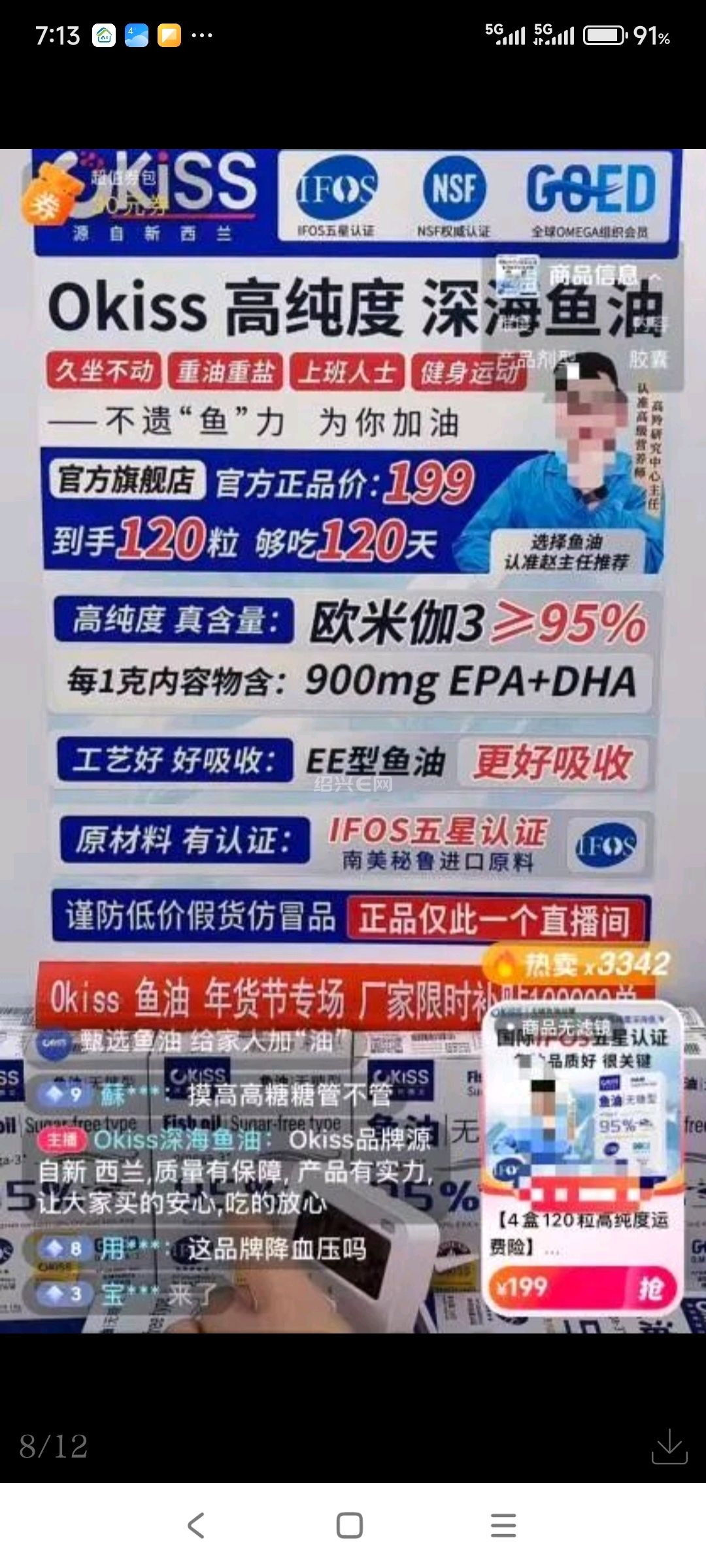 “Okiss深海鱼油”直播间里,主播正在热情推荐,一款所谓“源自新西兰”的深海鱼油产品。