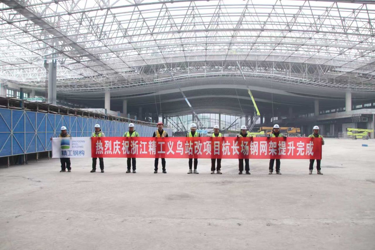 近日,沪昆铁路义乌高架站房B2区钢屋盖顺利完成提升作业!这是精工钢构承接的义乌站高架站房钢屋盖第四次提升,也是继C区、B1区、A区之后,项目最后一块钢屋盖的提升施工。