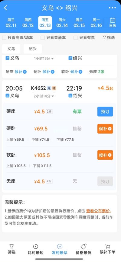 该趟车 衢州→绍兴、金华→绍兴和义乌→绍兴也有2折硬座票出售