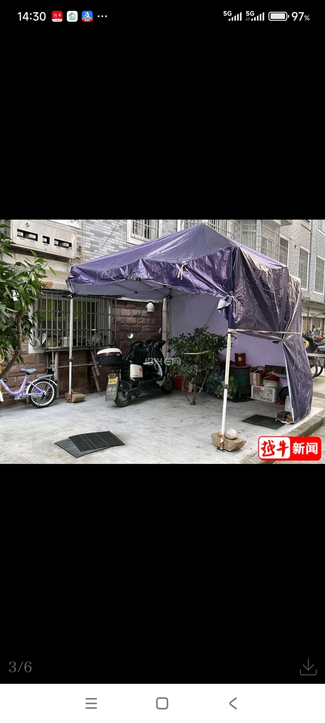 “我一人住在这车库里,棚子是我自己搭的。”今年90岁的齐大爷告诉越牛新闻记者,他从黄酒小镇拆迁后搬到该小区,因年事已高、行动不便,无法上下楼梯,只能暂住车库。“车库太小,做饭的油烟散不出去,搭个棚子既能在外面做饭,还能放些杂物。”