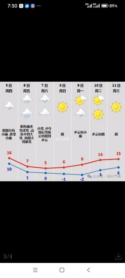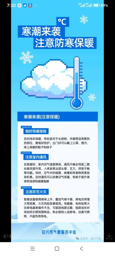 【绍兴气象今晨发布寒潮警报】目前寒潮已开始影响绍兴市,全市将有一次剧烈降温、大风和雨雪过程,日平均气温过程降温幅度可达10°C左右,并伴有5~7级偏北阵风;8至9日早晨最低气温-2~-4°C,有冰冻,山区-5~-8°C,有严重冰冻,请注意加强防范。