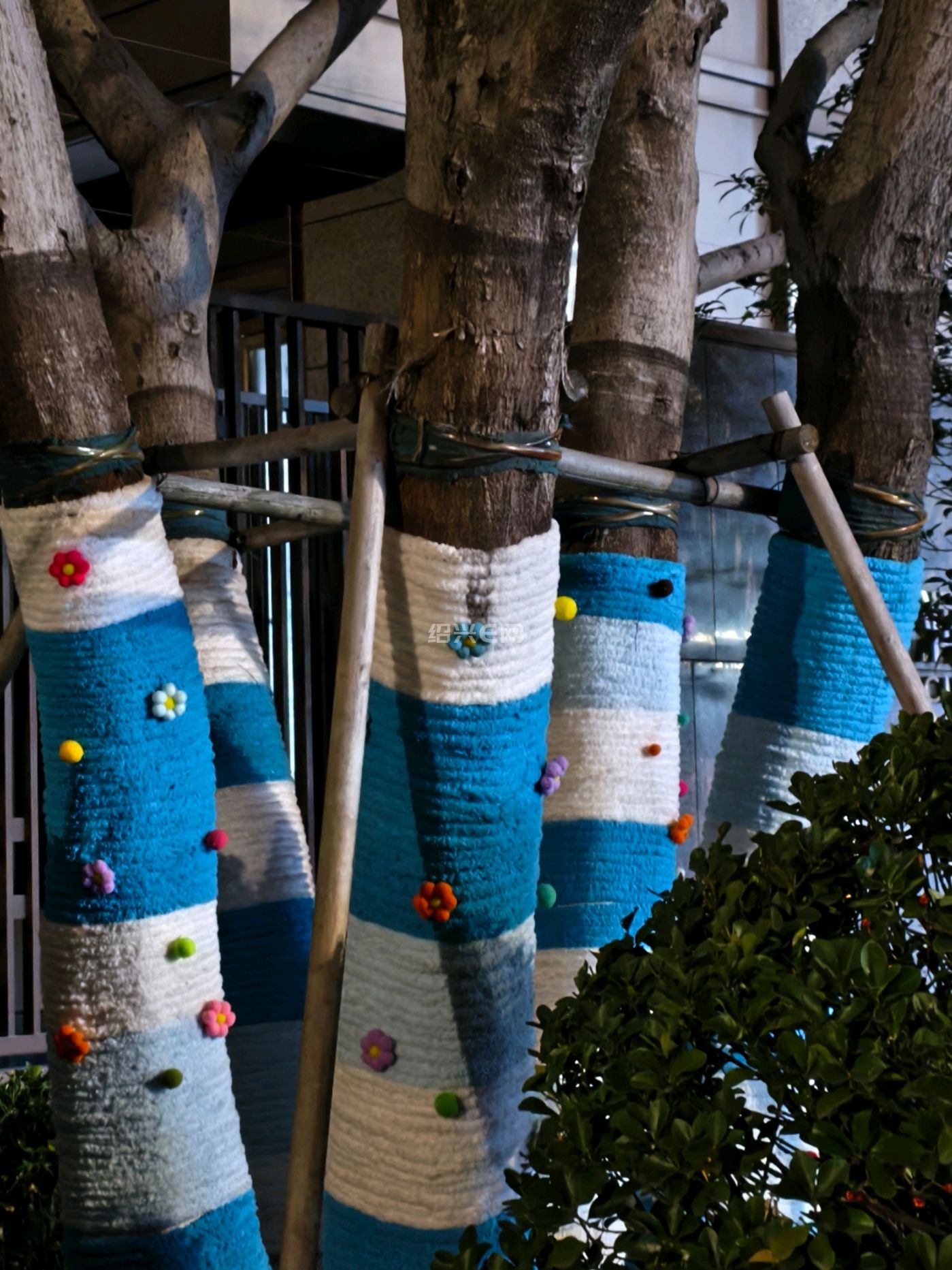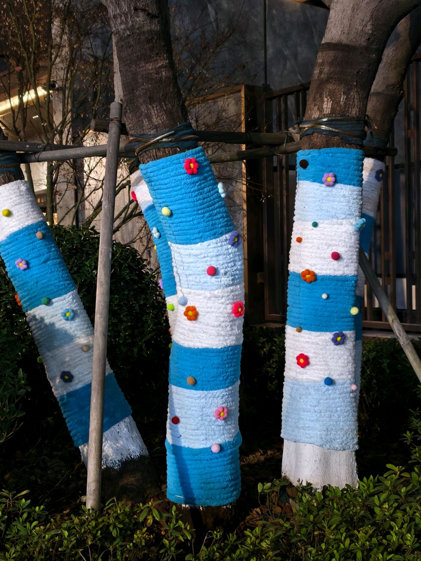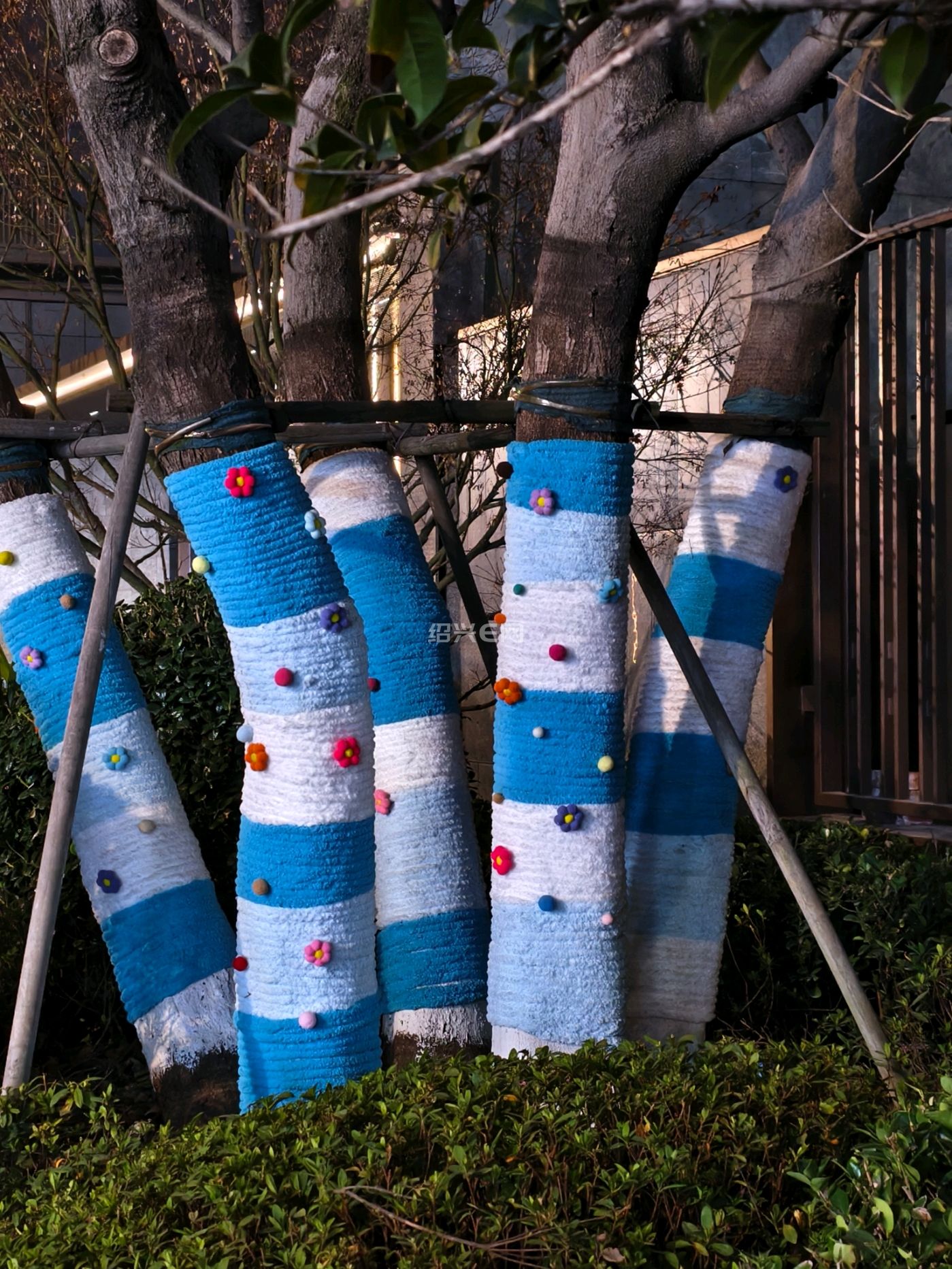 绍兴天地旁边有一颗树,这树不高,但枝干有五颗好似五胞胎,它们个个穿着蓝白色新衣迎接过年。