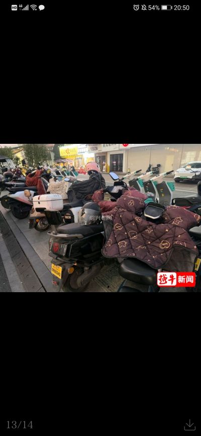 绍兴街头停放的电瓶车,多半都加装了挡风被。