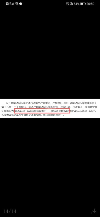 其中第六条对电动自行车非法加装车蓬的行为进行了规定,“一律依法现场拆除。”但文中并未出现严禁加装挡风被的内容。
