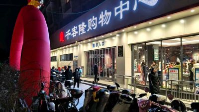 昌安千客隆超市开业第二天,乐队还在门口卖力地演奏,现场挺热闹的