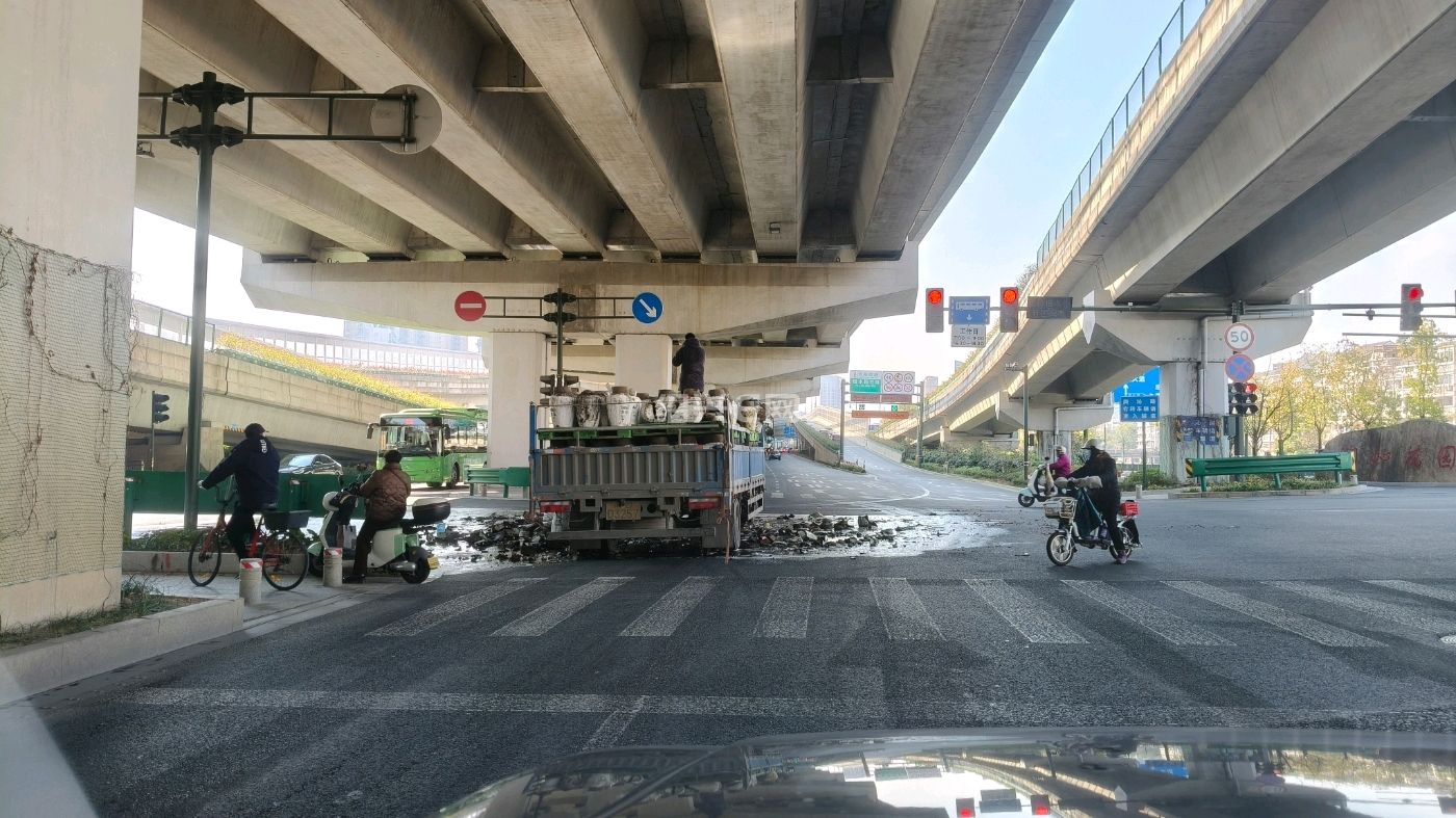就在刚才,二环北路润沁花园小区入囗红绿灯处,一辆满载坛装黄酒的货车停在马路中间,车上和地上有好多坛黄酒都碎了,现场酒香扑鼻!