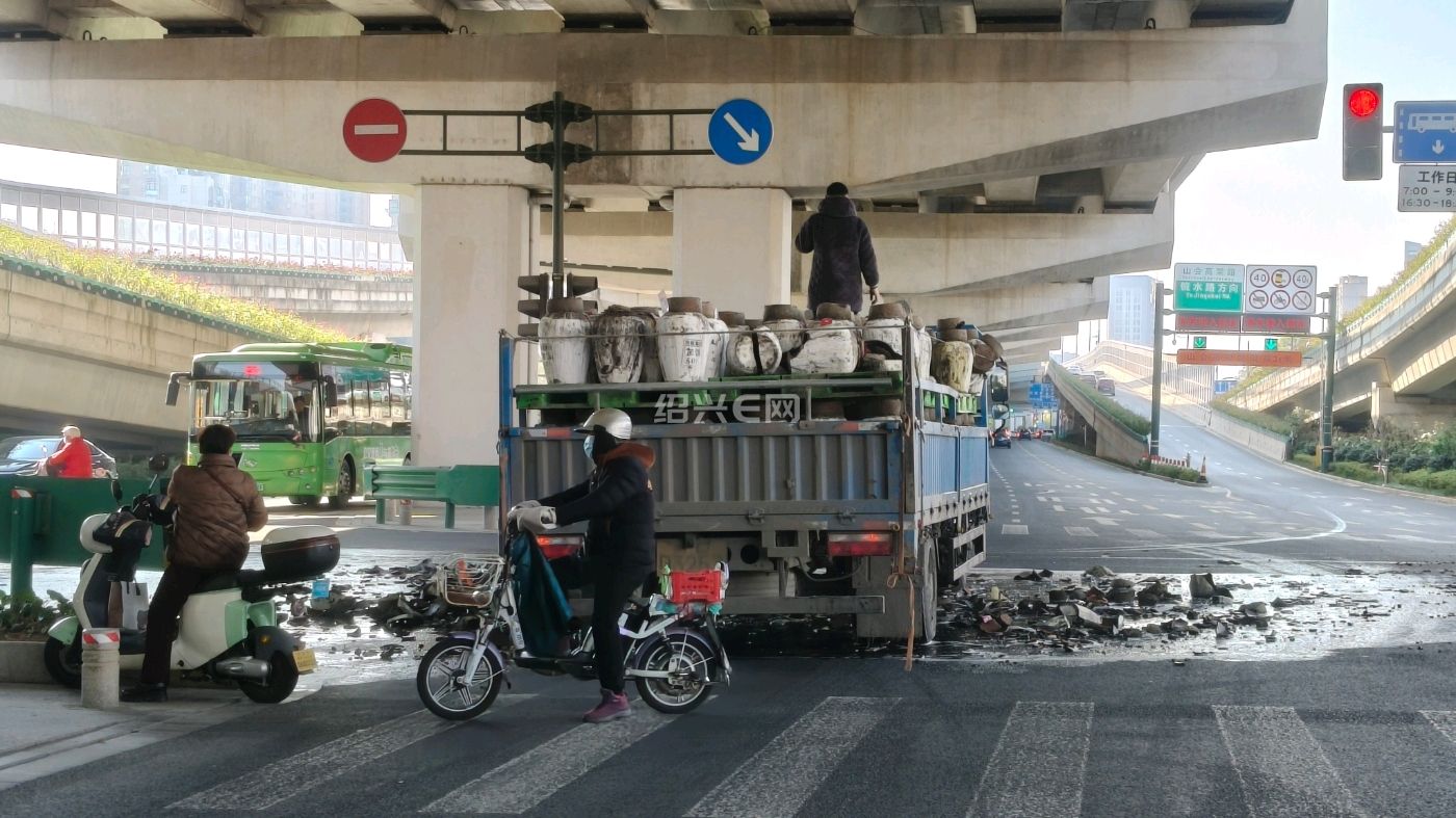 这次损失有点大哦,车上载的坛装黄酒碎了很多坛!
