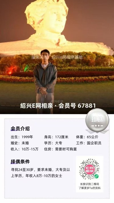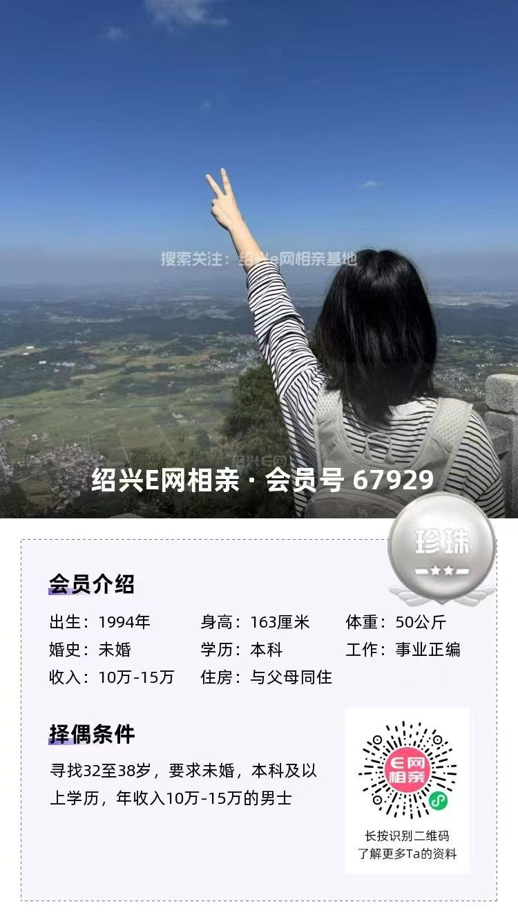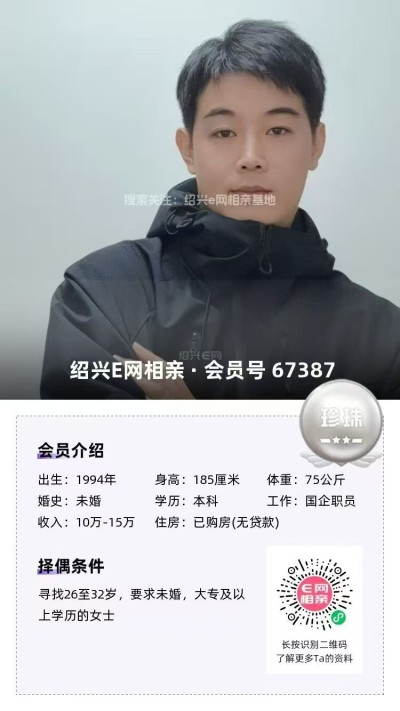 新来的94年花样美男/公司职员本科/33岁/属狗原籍湖南越城工作年薪10-15万房车俱备性格阳光善良/待人真诚和善喜欢书画/乐器/唱歌/户外~父母都在老家,都有退休医保,他自己在绍兴这边生活,自理能力没得说,还烧的一手好菜。加分加分寻觅:29-36岁之间,性格温和大方的未婚女生。钟意可私信小胡姐介绍+67953