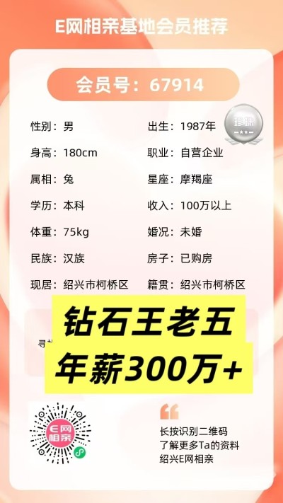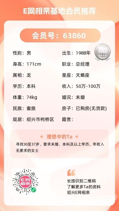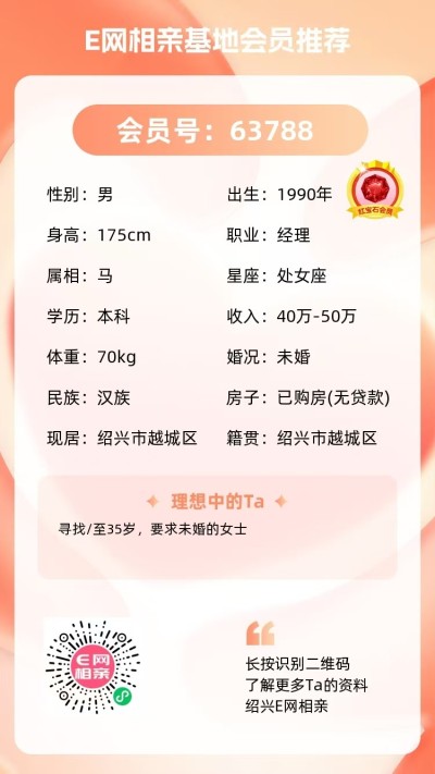 一、实名认证会员,证件齐全,身份明确,可联系工作人员升级VIP会员,参与红娘个对个私下介绍或者直接安排见面,可报名参与相亲基地的各种大小型专场相亲会,以及种类繁多的相亲活动;