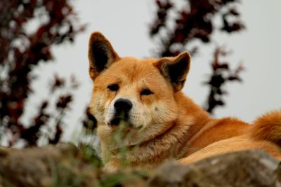 这不,我们刚放下桌子,摆出食盒,一只赭黄土狗便闻香而至,它不叫不闹,只是抬头可怜巴巴地看着我吃饭,乞怜的目光逼我不得不与它分食。不一会又来了一条灰白色的小奶狗,一路摇着尾巴,眼光迷离朦胧,蹭到脚边乞讨,忍不住不给,结果一碗红烧肉分一半给了两条狗。看来它们还不满足,最后肉汤拌饭给了一碗,小奶狗吃得津津有味,完了就直接躺在椅子边接受抚摸,一副惬意享受的模样,啃着几块奶酪酥糖,吧嗒吧嗒,牙齿粘在了一起。大的那条看到我们收拾起了餐具,就到别处晃荡去了。想必东村客人常来,村狗都有到客边蹭吃的习惯。