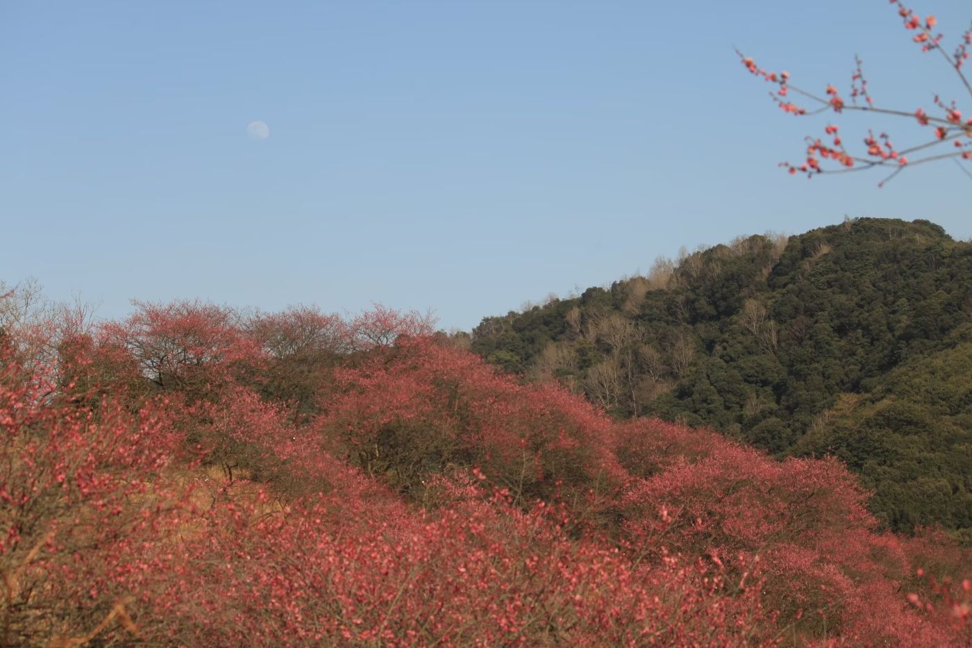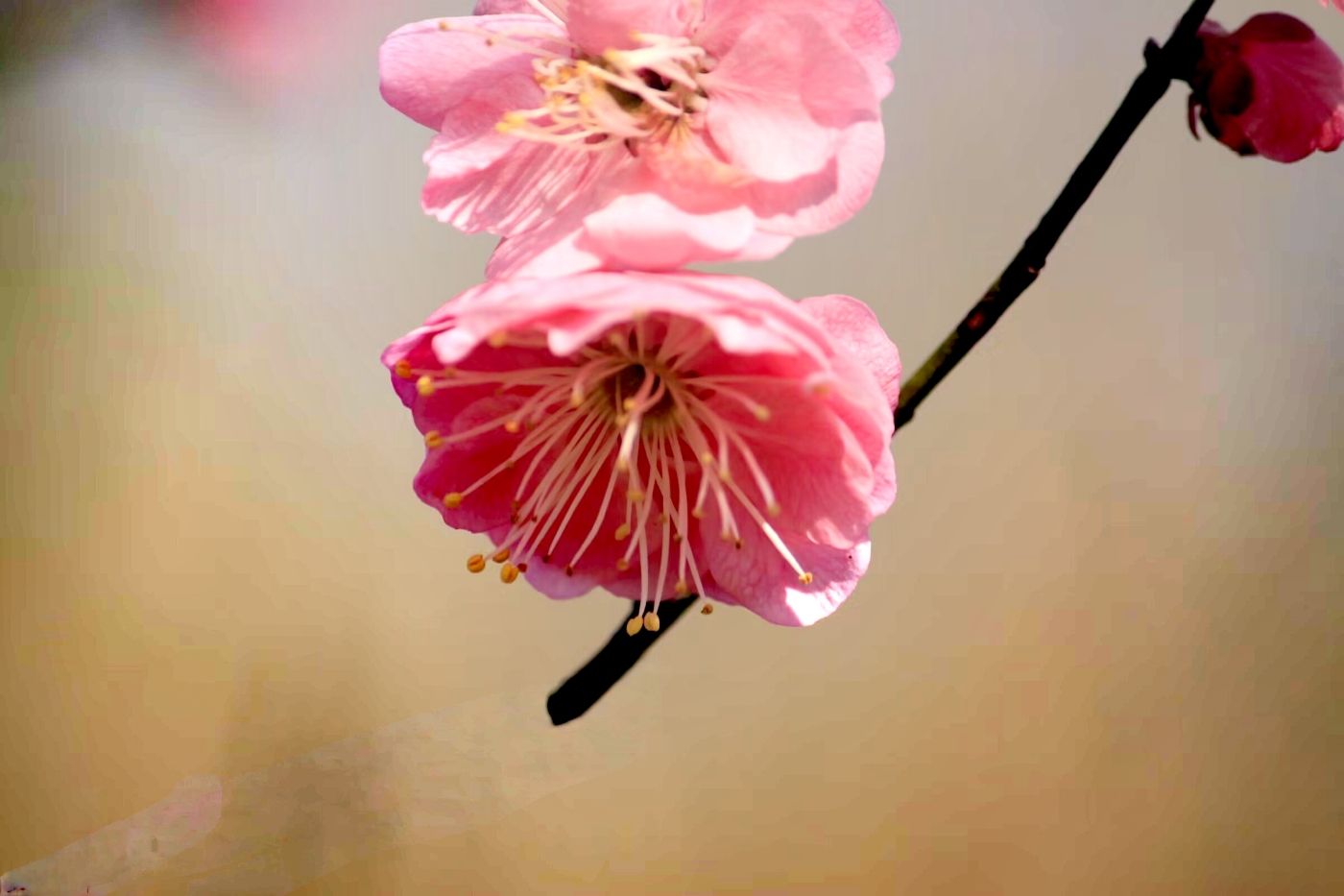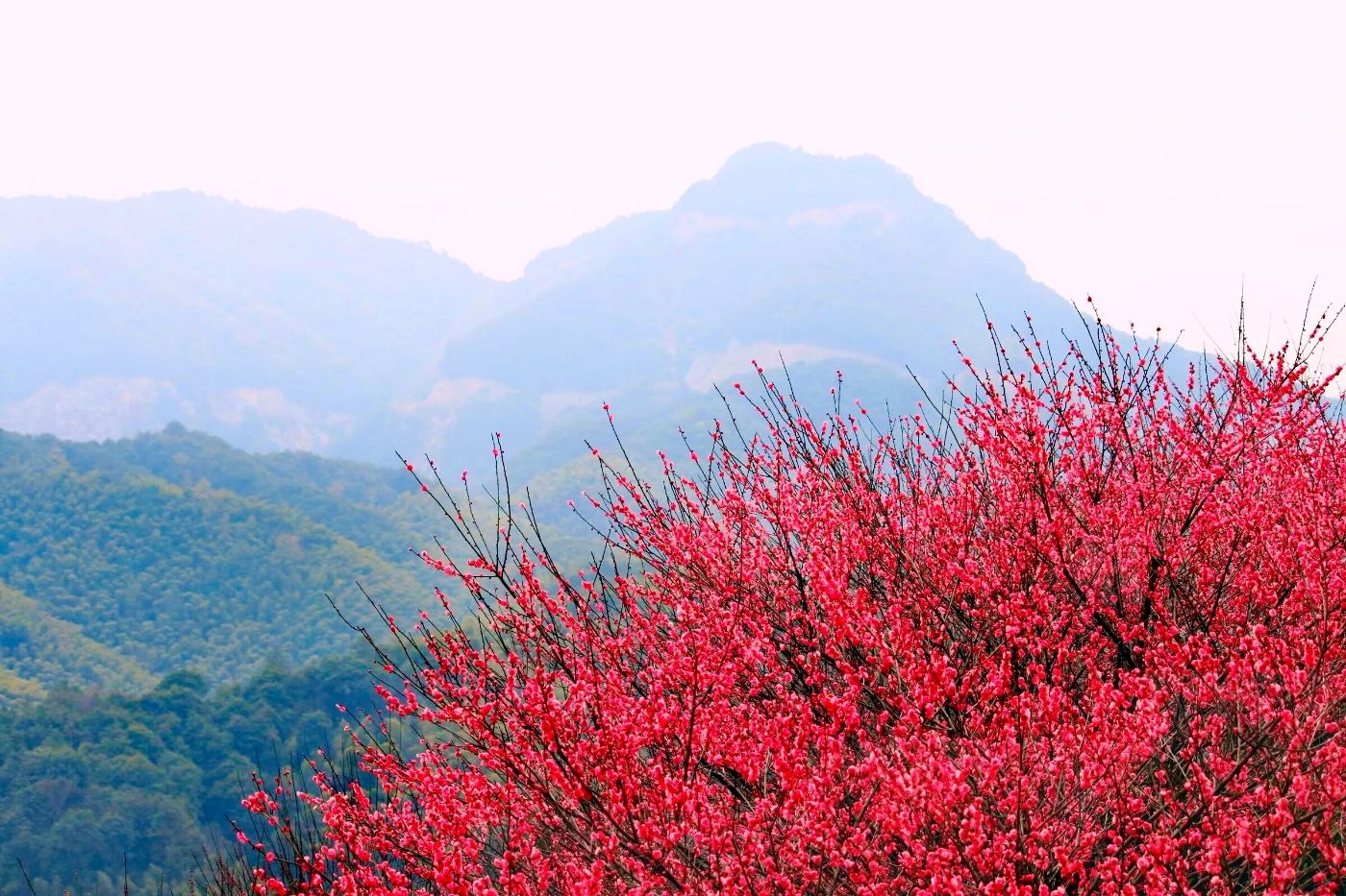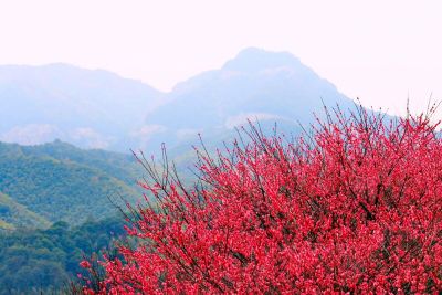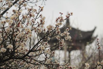 午后风暖,游客很少,便从煮酒亭上山,红梅正盛花期,忙煞一群群蜜蜂,一路闻馨香,一路听嗡嗡。青梅零星开放,大多还是花骨朵,映衬着蓝天,倒像满天的银光小星,却散发缕缕暗香,在暖风中摇曳……