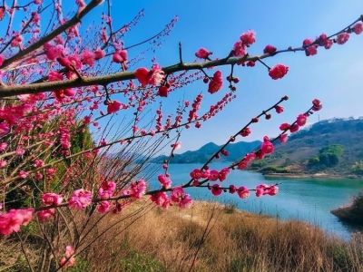 赏梅步道沿油湾岭蜿蜒起伏,岗上梅红灼灼,远岭白云悠悠。青梅点点缀山坡,鸟鸣幽幽荡山谷。路过后屋村的山塘,记得几年前来过,“疏影横斜水清浅,暗香浮动月黄昏。”这里便入这番意境,坐在道边石凳上,便作曲