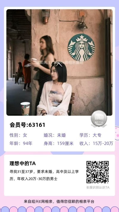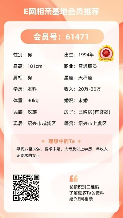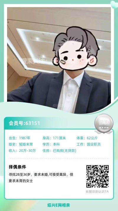 87年国企管理工作男生短婚未育,个性不合,了解分开越城区独生子,身高171,本科学历国企部门主管,收入20-30万,有房有车无贷款。娟娟见过本人,为人谦和,品貌端正个性真诚稳重,喜欢读书运动,不抽烟合适留言娟娟牵线+63151