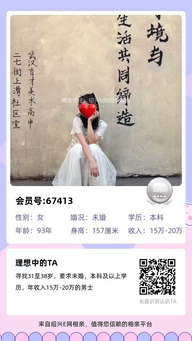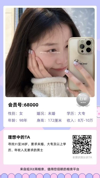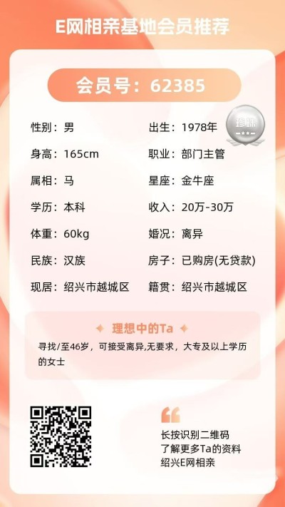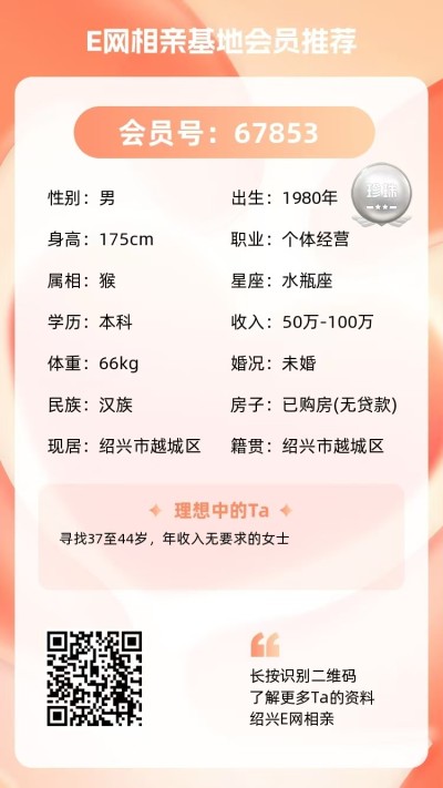 80年个体经营的越城男士未婚,个体经营,年收入100万左右有房有车无贷款本科学历,爱好文学,为人正直真诚保养得好显年轻,心地善良,诚心找对象结婚,寻找42岁内,善良传统的女生,其他不限合适留言娟娟牵线+67853