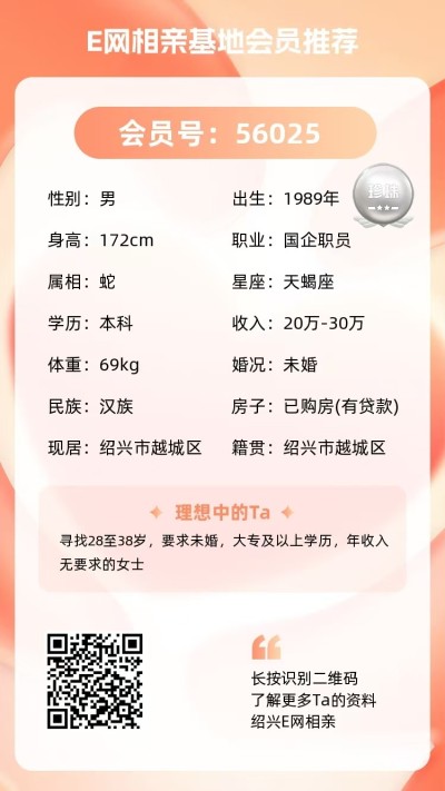 成熟稳重的国企男生推荐89年未婚,越城独生子,本科,身高172。老牌国企工作,另有副业,收入20-30万(低调)有房有车。本人娟娟见过,彬彬有礼,真诚爱笑,为人忠厚,性格外向,喜欢结交朋友,爱音乐,也会做家务会烧饭,做事认真行动力强,做老公的首选哦合适可以留言娟娟牵线+56025