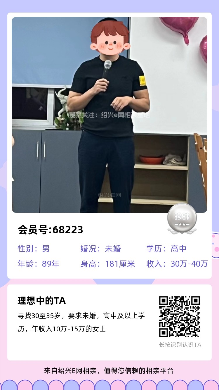 新来的89年硕士男生未婚,越城区独生子,自营公司,年收入40-50万,有房有车本人娟娟见过,个性简单务实,待人真诚,直来直往有责任心和上进心,喜欢运动想认识他私聊娟娟+68214