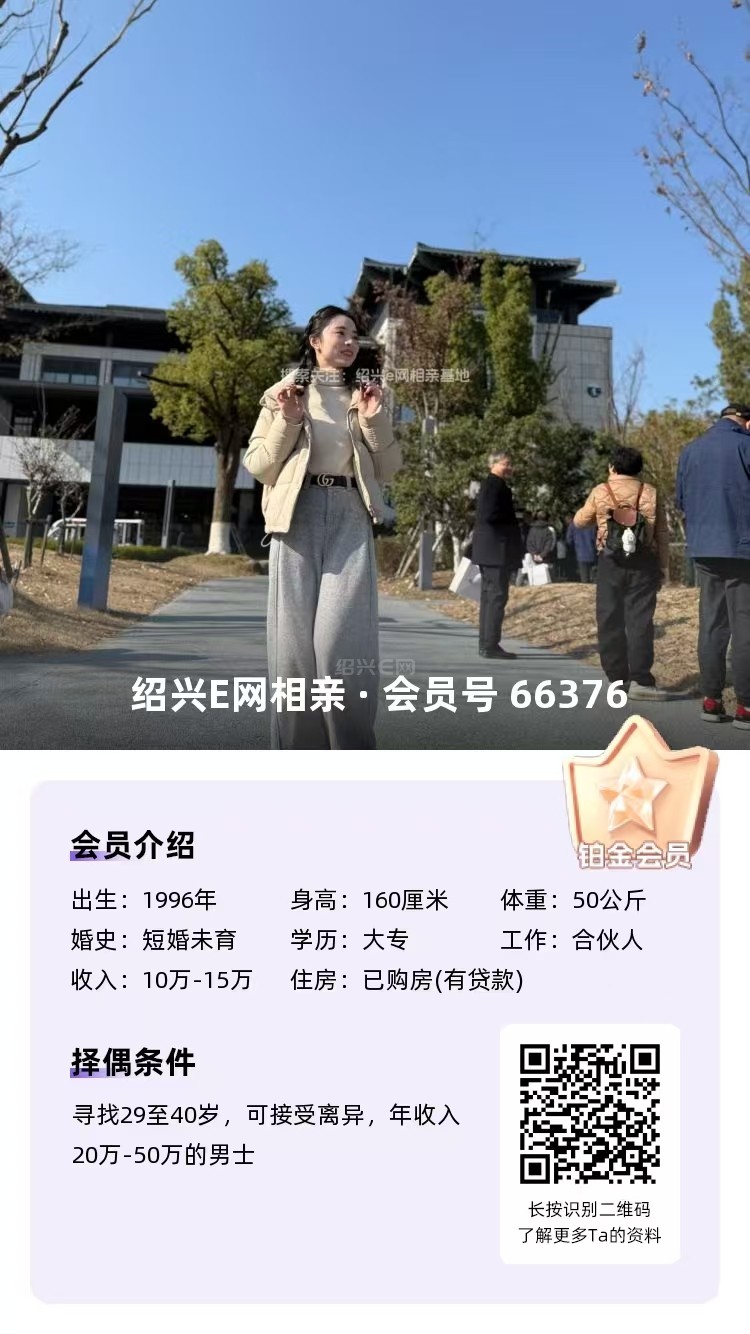 知性优雅的91年离异女士越城区独生女,大专学历,纺织公司经理,收入20-30万,房车俱备无贷款本人娟娟见过,高挑秀丽,气质不俗正直善良果敢,温柔有力量,三观正独立务实的摩羯座,理性成熟喜欢户外运动,摄影合适留言娟娟牵线+65481