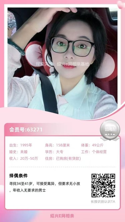 个性独立勇敢乐观的95年女生未婚,本人娟娟见过,美丽时尚,开朗大方在柯桥经商多年,收入20-50万,有房有车全家都在柯桥定居可以接受离异,希望认识各方面条件成熟,家庭和睦,有素质有涵养的男生[愉快]钟意留言娟娟牵线+63271