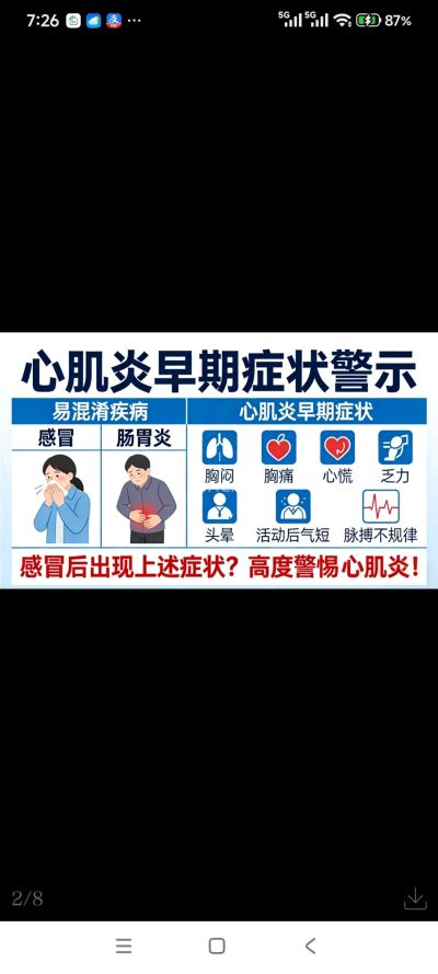 关键提示:心肌炎早期症状常与感冒、肠胃炎混淆。若感冒后出现胸闷、胸痛、心慌、乏力、头晕、活动后气短、脉搏不规律,应高度警惕心肌炎!