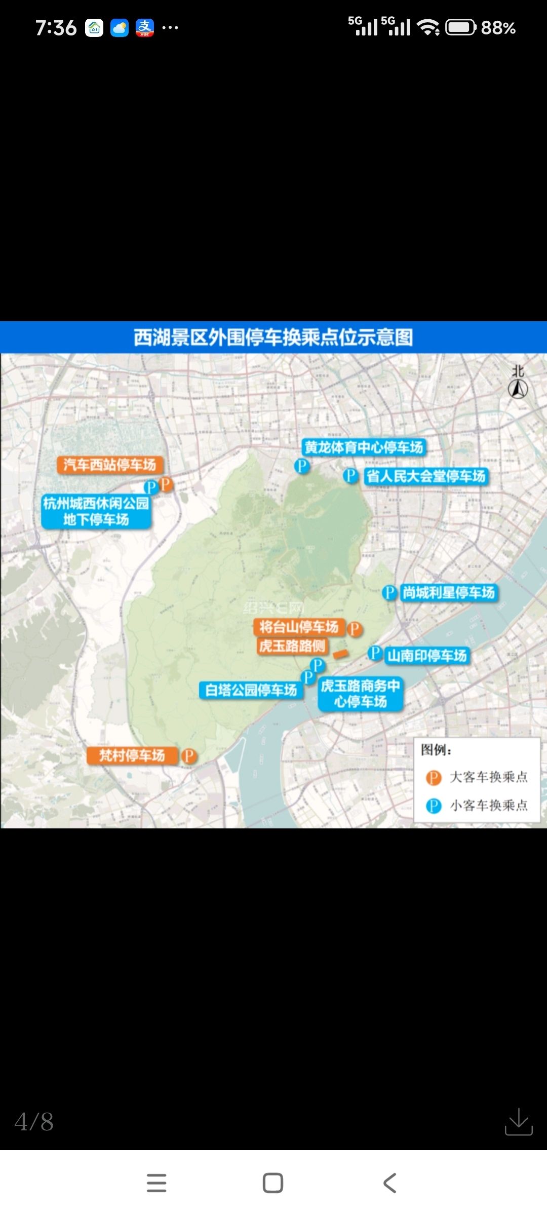 西湖景区停车资源紧张,强烈推荐“外围停车+公交换乘”的出行方式。北面有杭州城西休闲公园、黄龙体育中心、省人民大会堂3个换乘停车场,东面和南面有尚城利星、山南印、白塔公园、虎玉路商务中心4个换乘停车场,每个换乘点都设有公交接驳线路,带您直达主要景点,建议出发前使用导航搜索停车场名称。