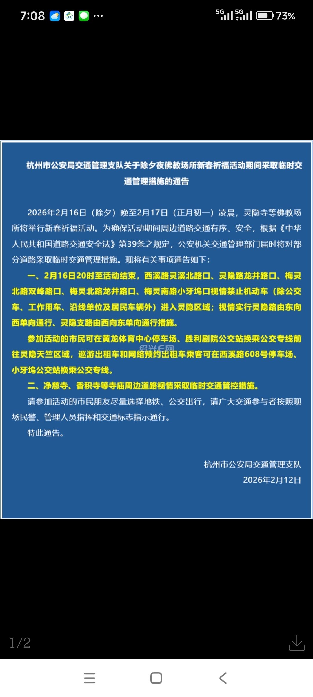 2026年2月16日(除夕)晚至2月17日(正月初一)凌晨,灵隐寺等佛教场所将举行新春祈福活动。为确保活动期间周边道路交通有序、安全,根据《中华人民共和国道路交通安全法》第39条之规定,公安机关交通管理部门届时将对部分道路采取临时交通管理措施。