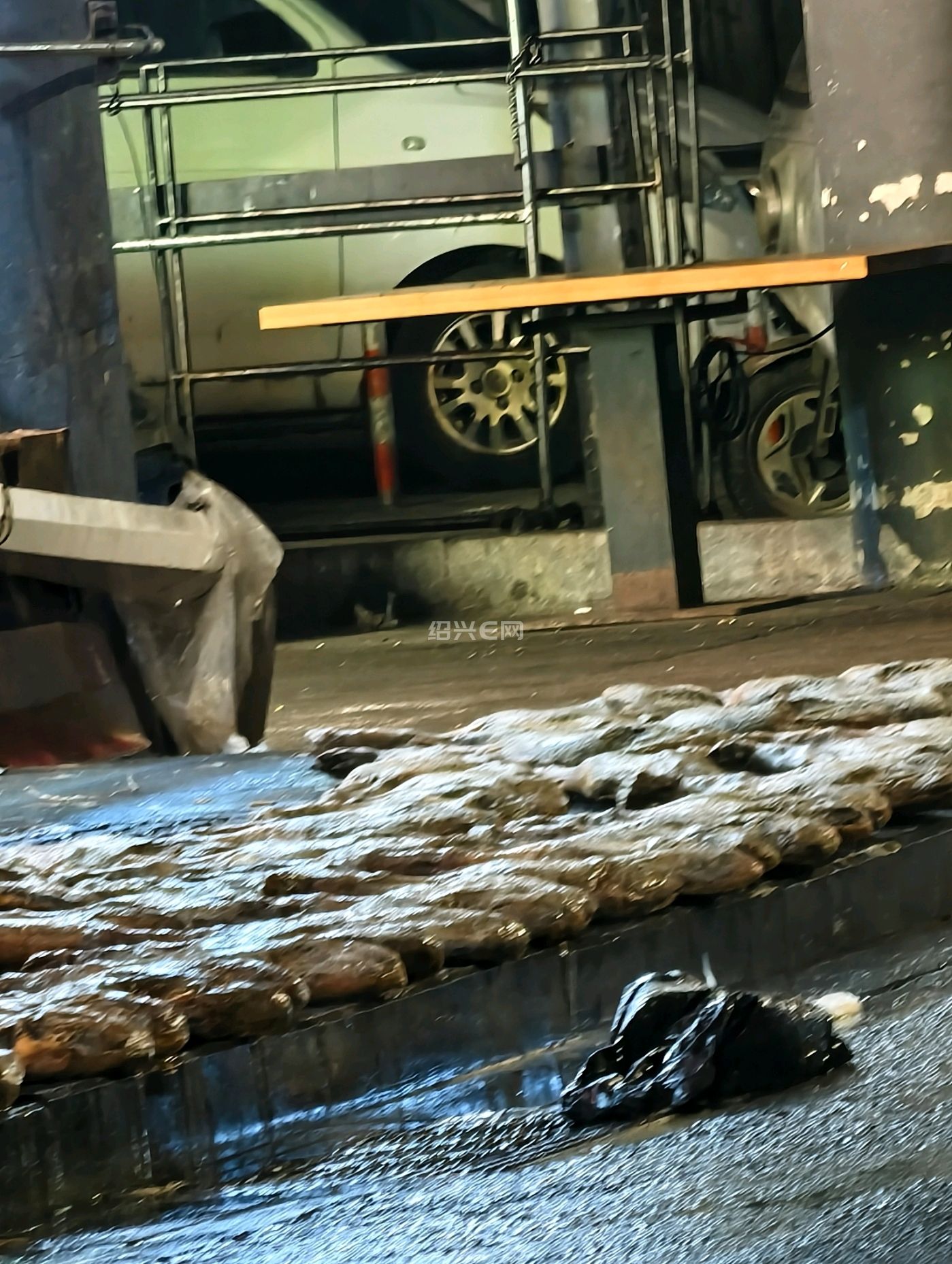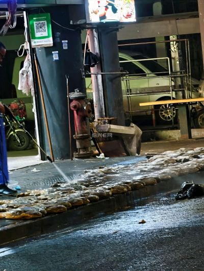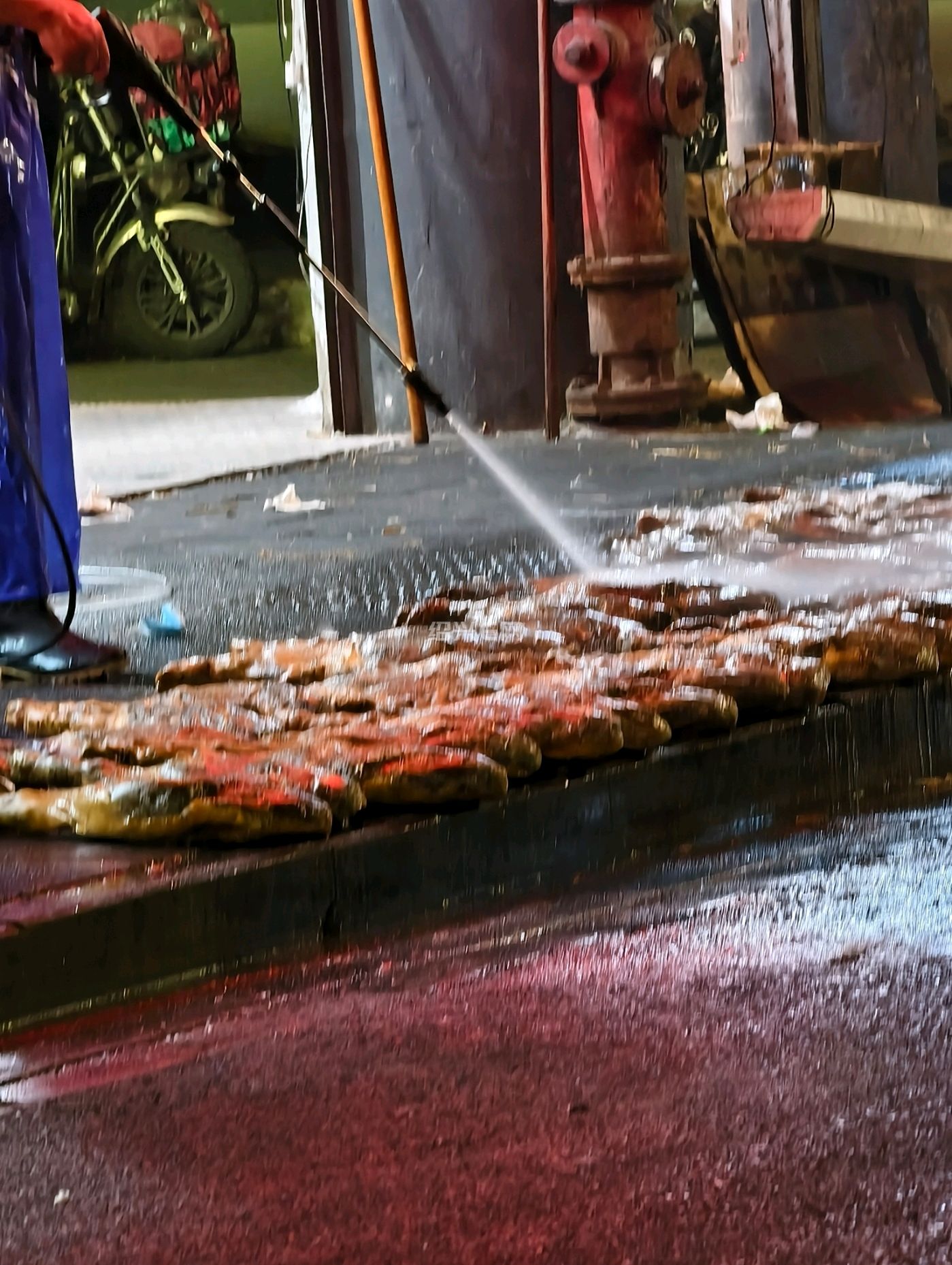 路过下大路看见地上一排火腿放在那里,老板拿高压水枪在冲洗,是不是要过年了把库存火腿拿出来冲洗一下再卖顾客