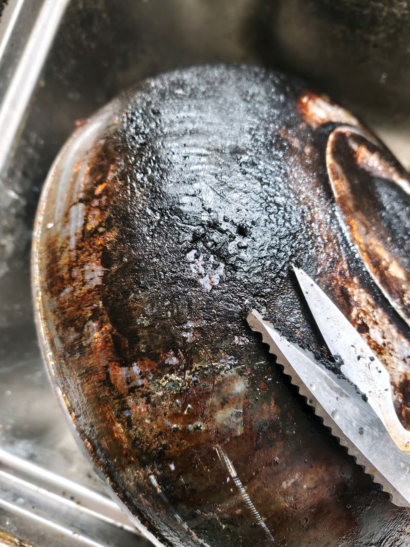 泡了好久,剪刀翘了好久,才去掉一点,网上买的去锅底灰的膏,或者喷喷的,试了没效果