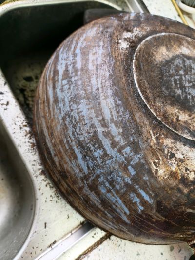 还是你的办法好,不过我没用水冲,我先把锅烧5分钟,然后直接用刀刮,这厚厚的灰唰唰往下掉,早知道这么简单,我还这个喷那个抹干嘛