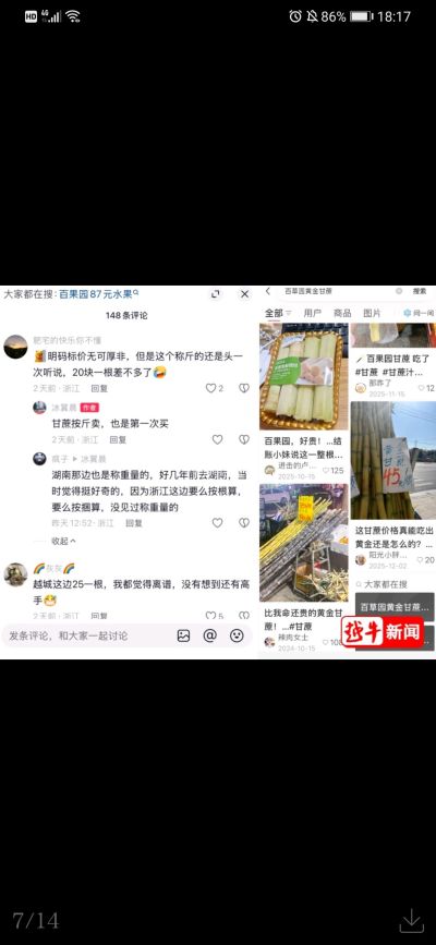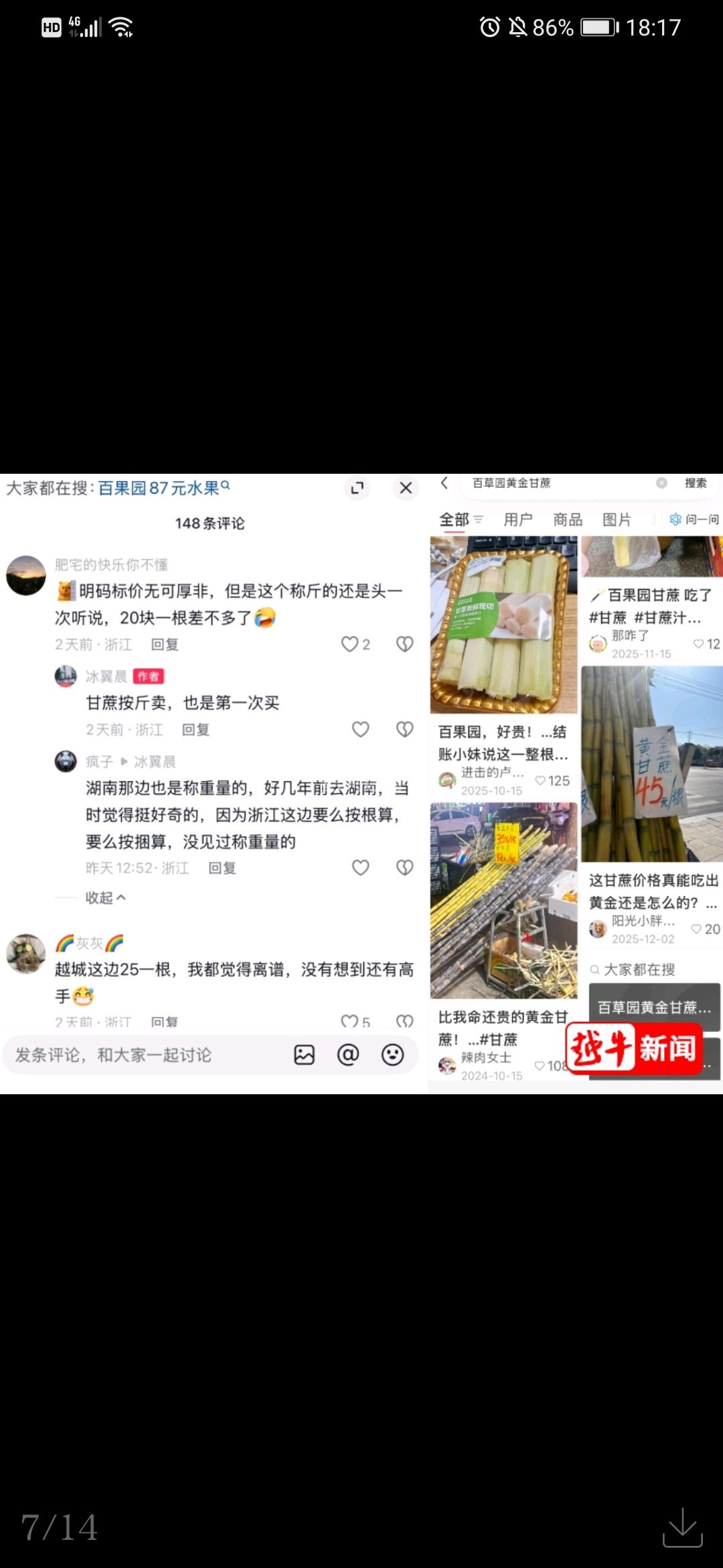 记者注意到,这根87元的“高价甘蔗”并非孤例。在当事人视频的评论区以及社交媒体上,不少市民留言称有过类似经历。
