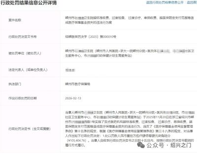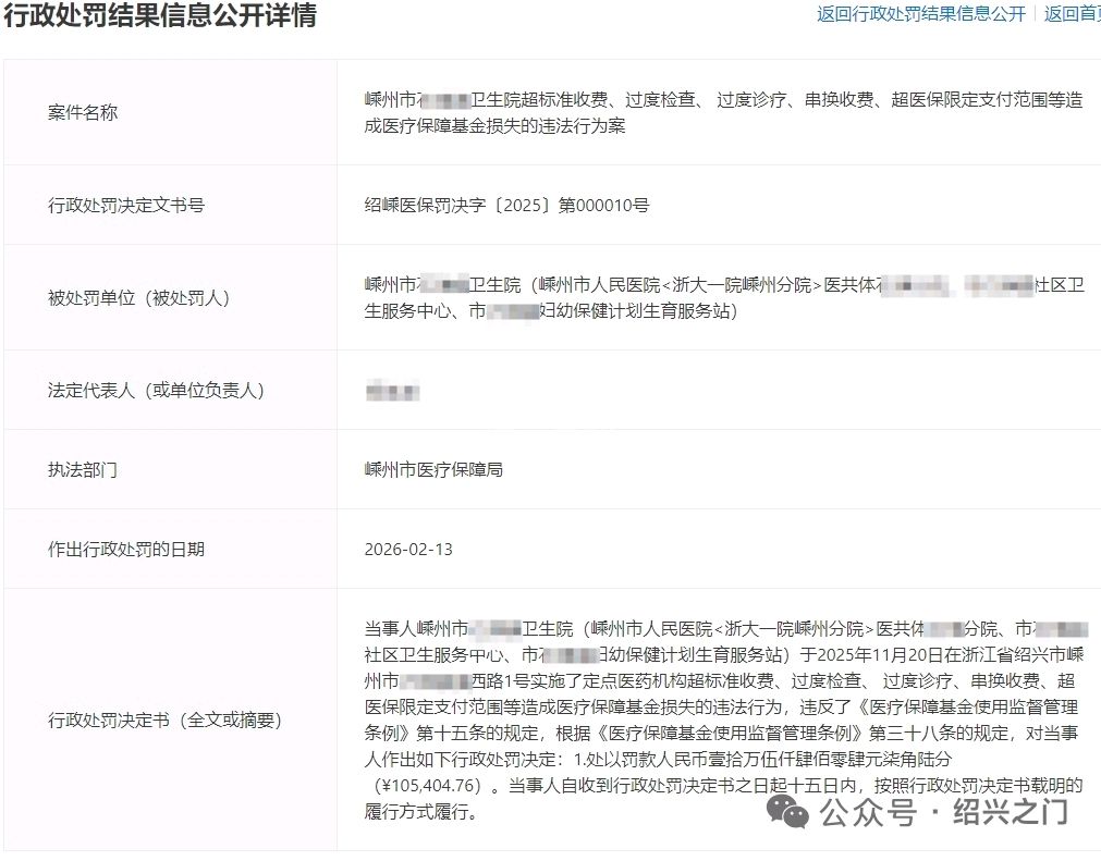 ? ??嵊州市**镇卫生院超标准收费、过度检查、过度诊疗、串换收费、超医保限定支付范围等造成医疗保障基金损失的违法行为案绍嵊医保罚决字[2025】第000010号嵊州市**镇卫生院(嵊州市人民医院医共体**分院、市**镇社区卫生服务中心、市**镇妇幼保健计划生育服务站)****嵊州市医疗保障局2026-02-13当事人嵊州市**镇卫生院于2025年11月20日在浙江省绍兴市嵊州市**镇镇西路1号实施了定点医药机构超标准收费、过度检查、过度诊疗、串换收费、超医保限定支付范围等造成医疗保障基金损失的违法行为,违反了《医疗保障基金使用监督管理条例》第十五条的规定,根据《医疗保障基金使用监督管理条例》第三十八条的规定,对当事人作出如下行政处罚决定:1.处以罚款人民币壹拾万伍仟肆佰零肆元柒角陆分(?105,404.76)。当事人自收到行政处罚决定书之日起十五日内,按照行政处罚决定书载明的履行方式履行。