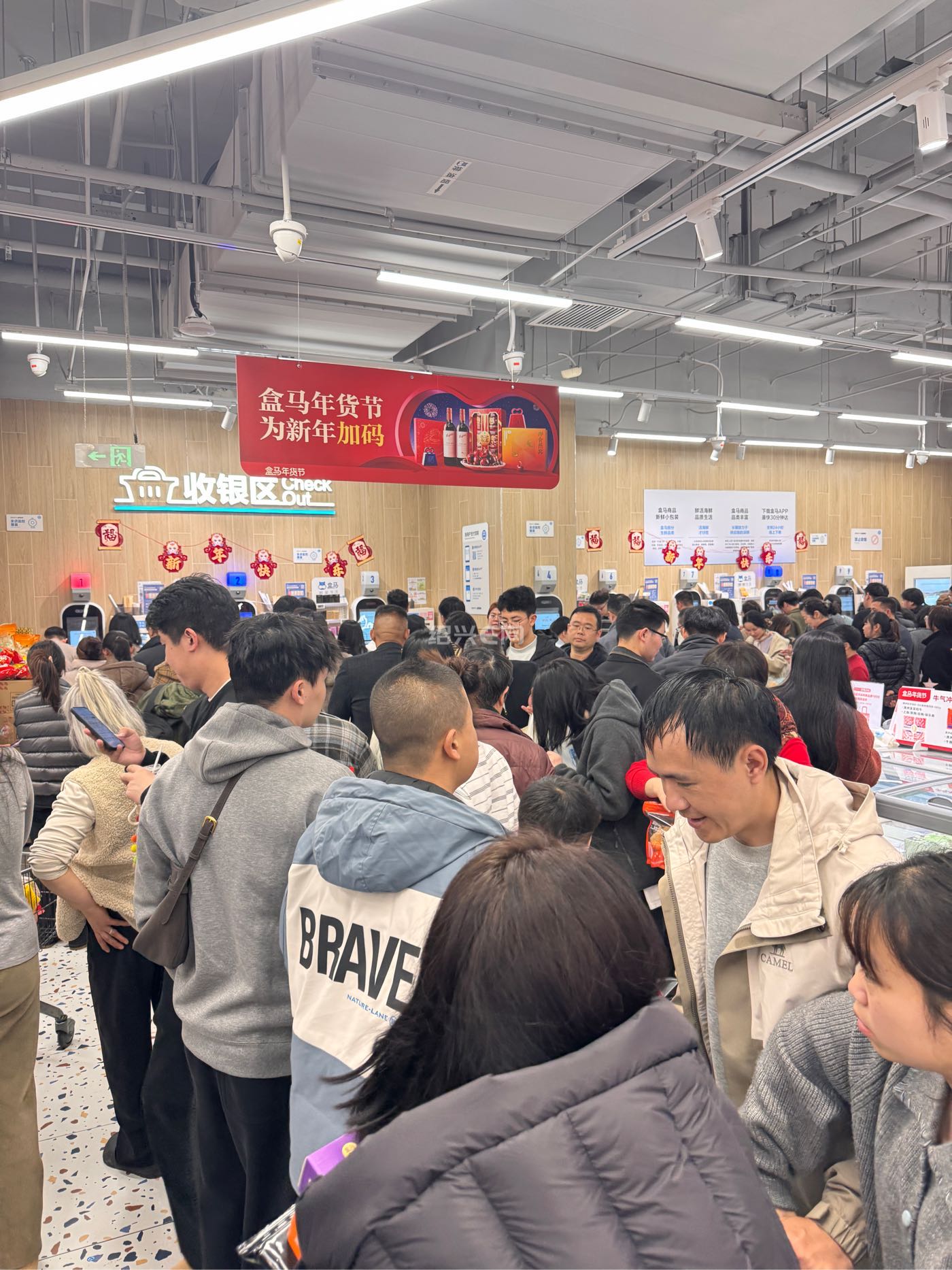 确实人多,中午飯后从地下車庫步行十来分钟进入盒马超市,人挤人,排队付费处都是长龙,