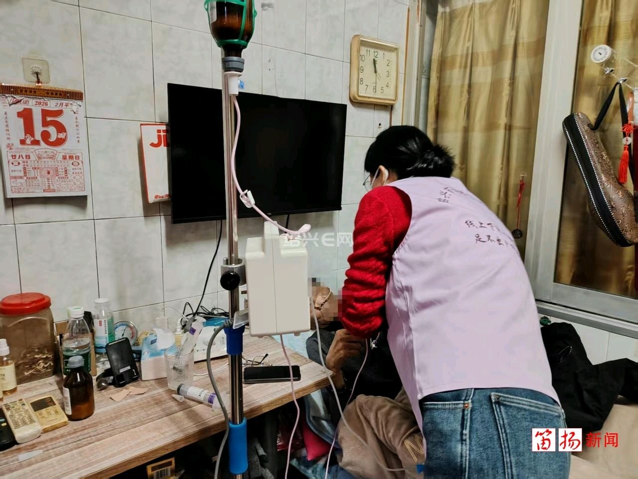 除夕当天,夏履分院护理团队放弃休息,带着专业器械奔赴李大爷家中。护士们严格规范操作,仔细检查鼻胃管状态、监测营养液输注、更换敷料、完成皮下注射,动作轻柔细致。同时,手把手指导家属掌握管道护理技巧,耐心讲解并发症预防与日常注意事项。