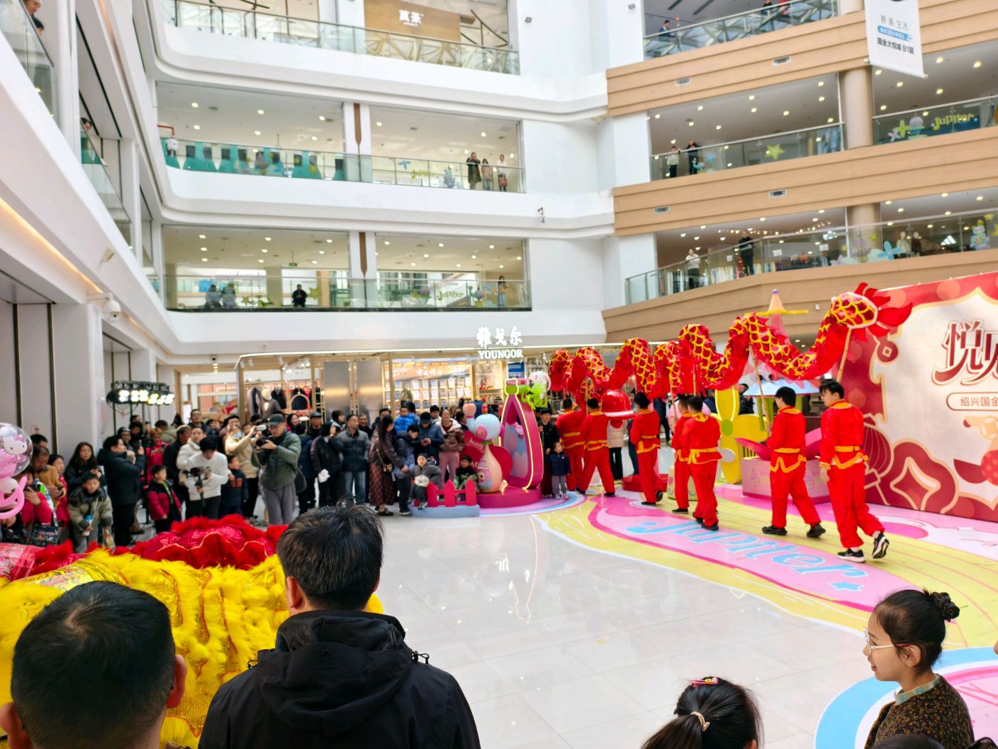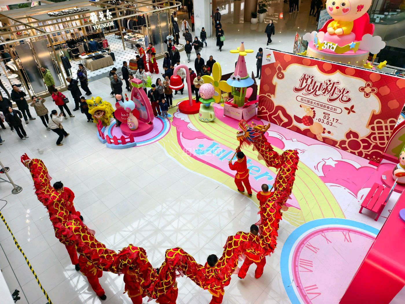 丙午马年新春,绍兴国金大悦城商场内锣鼓喧天。舞龙舞狮队穿梭巡游,腾跃翻滚间尽显喜庆,市民驻足观赏、拍照留念,沉浸式感受传统年俗魅力。