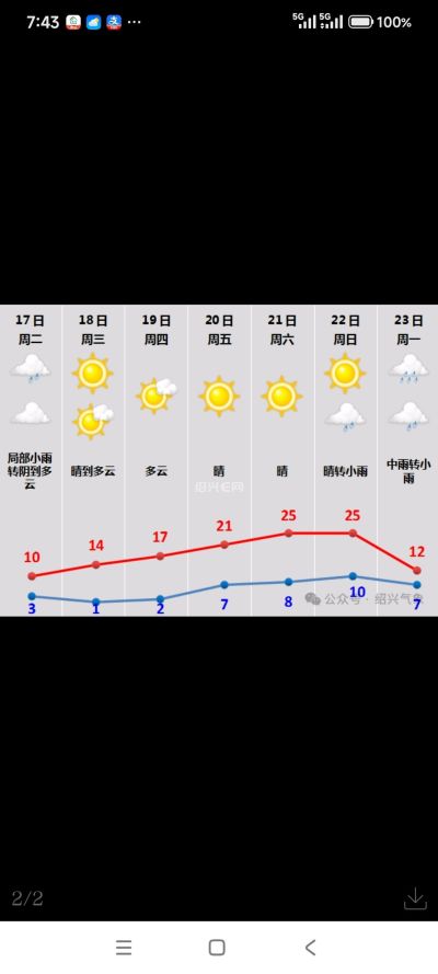 绍兴今天到22日前期也总体以晴或多云为主,白天最高气温大幅攀升,到初四即可回升至20℃以上,假期后半段连续三天保持20℃+,温暖如春。再次提醒早晚要出门的朋友还是要穿暖些,可以采取洋葱式的穿衣法,方便中午时段穿脱。