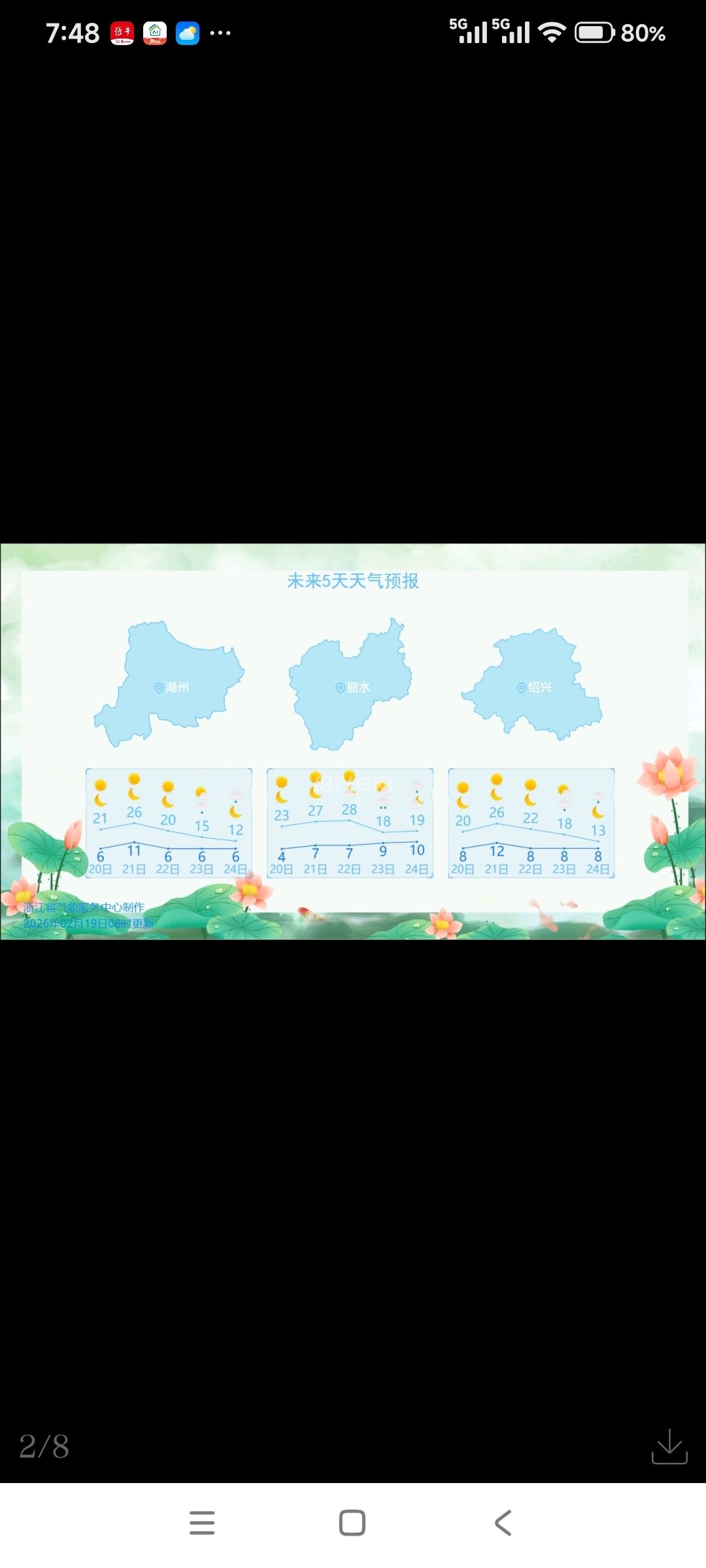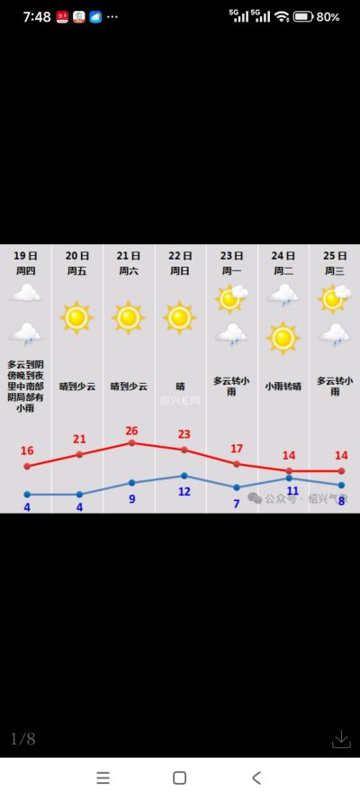 绍兴市气象台2026年2月20日6:00发布的短期天气预报:今天到明天晴到多云。偏南风2~3级。今天最高气温:19~20℃,比昨天偏高4℃左右;明天最低气温:7~9℃,比今天偏高2℃左右。后天晴12~23℃。