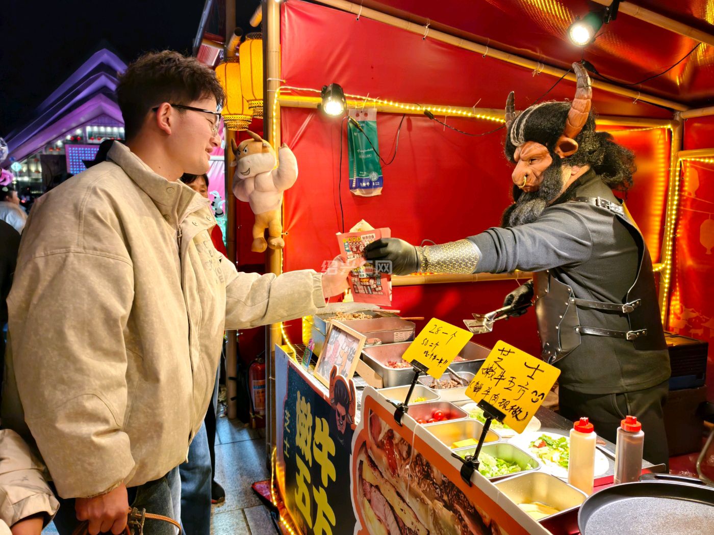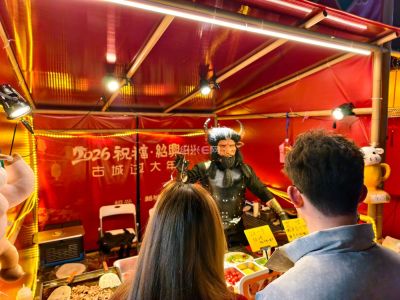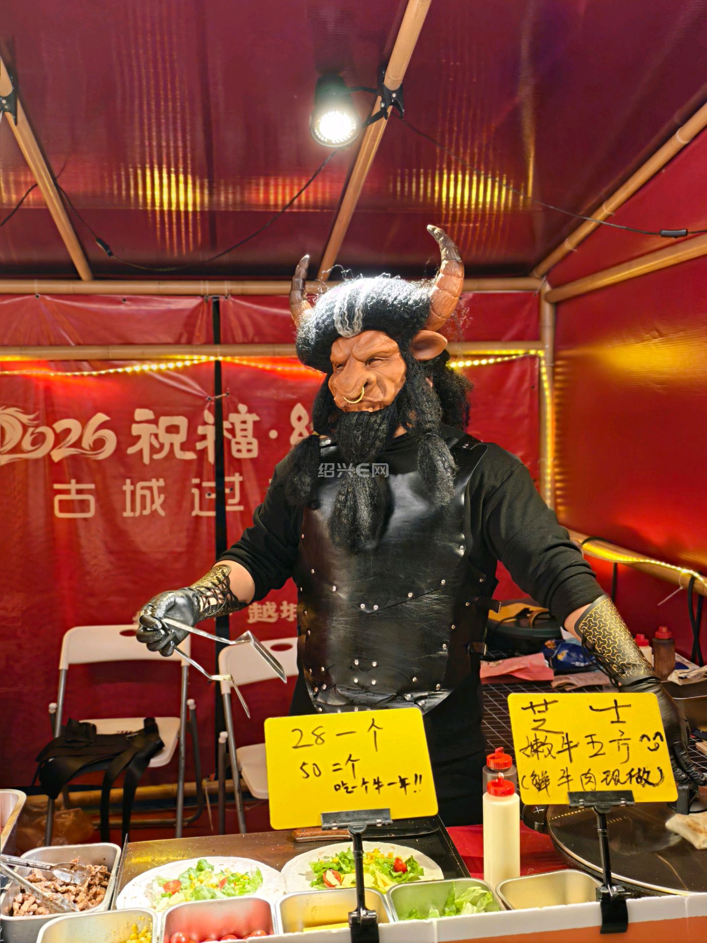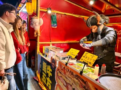 绍兴城市广场新春集市上,“牛魔王”摊主现身小吃摊,独特扮相搭配小吃,成集市网红打卡点,为市民游客增添了浓浓年味与趣味体验。
