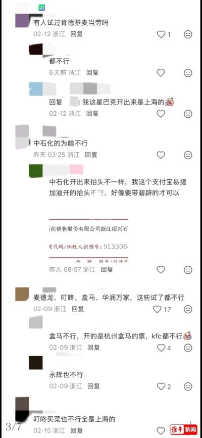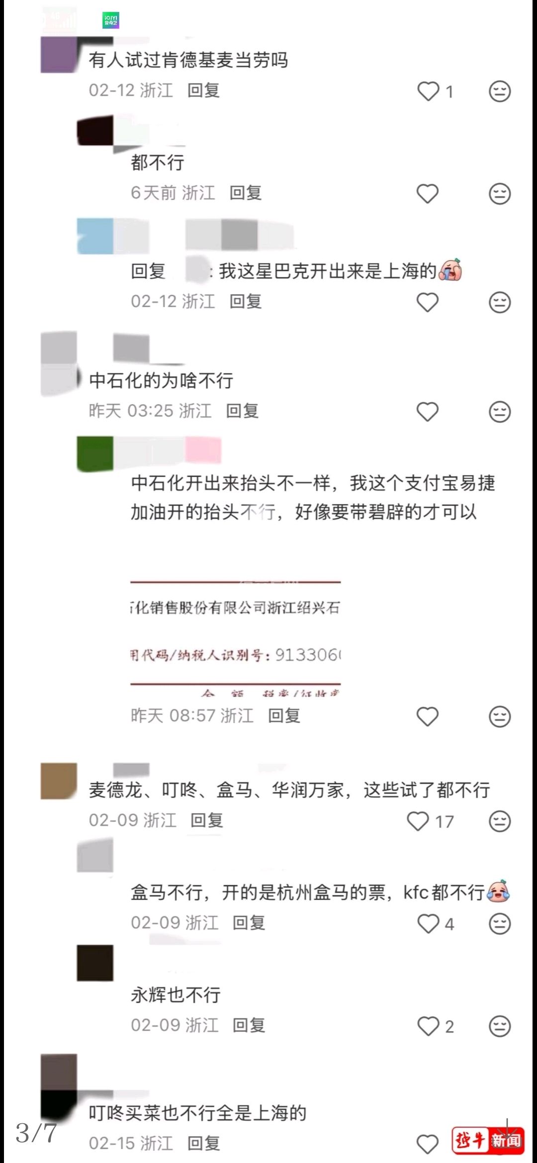 记者调查发现,在小红书等社交平台上,类似的吐槽帖层出不穷。有消费者甚至整理出一份长长的“避雷名单”,涵盖山姆、盒马、永辉、肯德基、麦当劳、喜茶、叮咚买菜、华润万家等多个知名品牌。这些商家的共同点在于:尽管门店位于绍兴,开具的发票其销售方信息却显示为杭州、上海等外地公司。