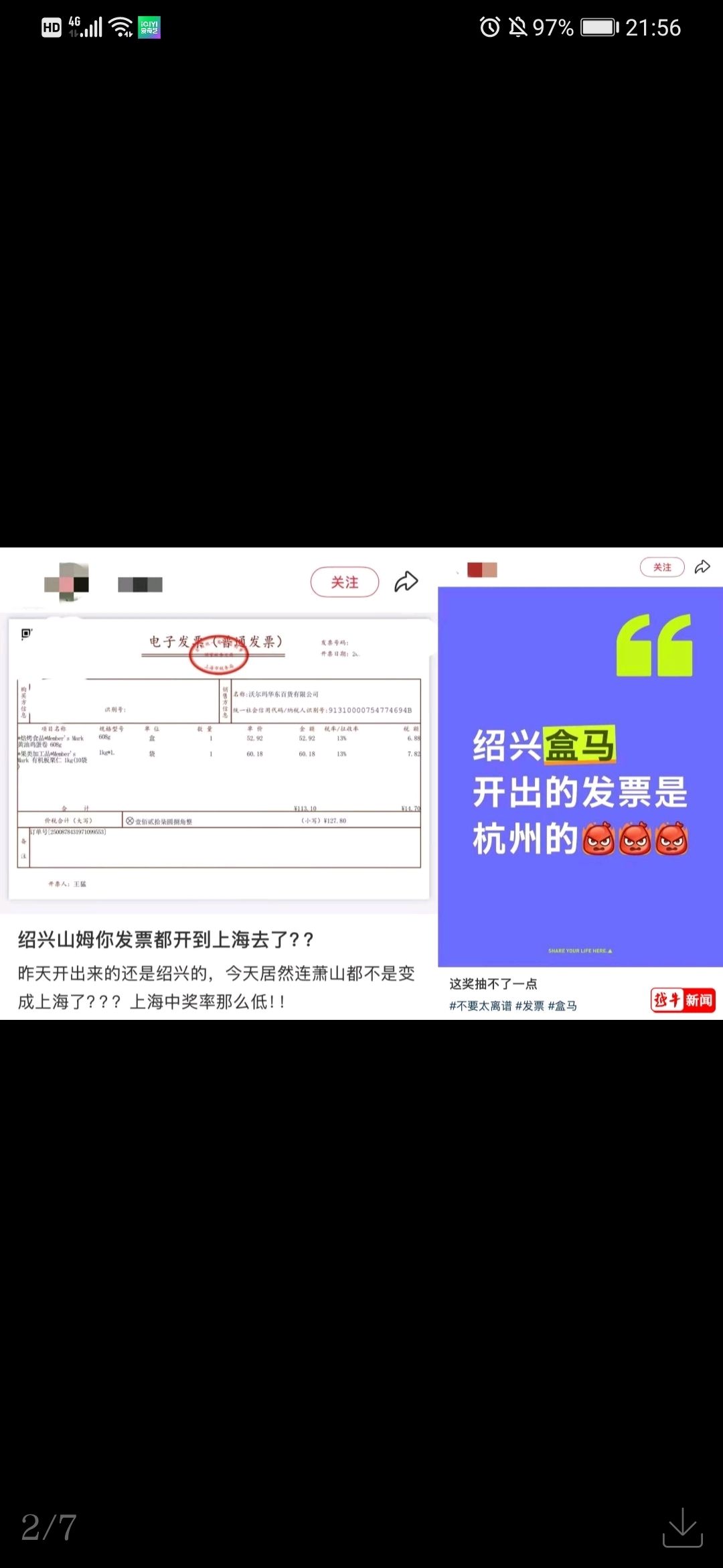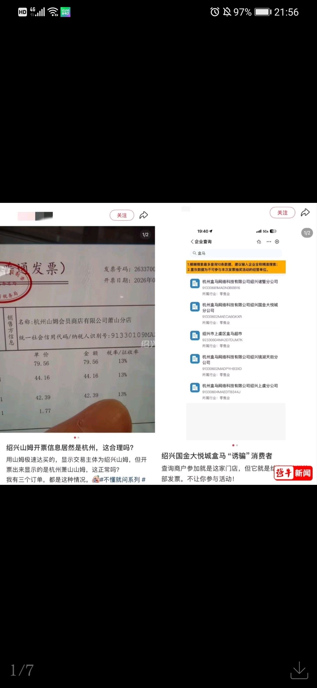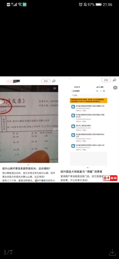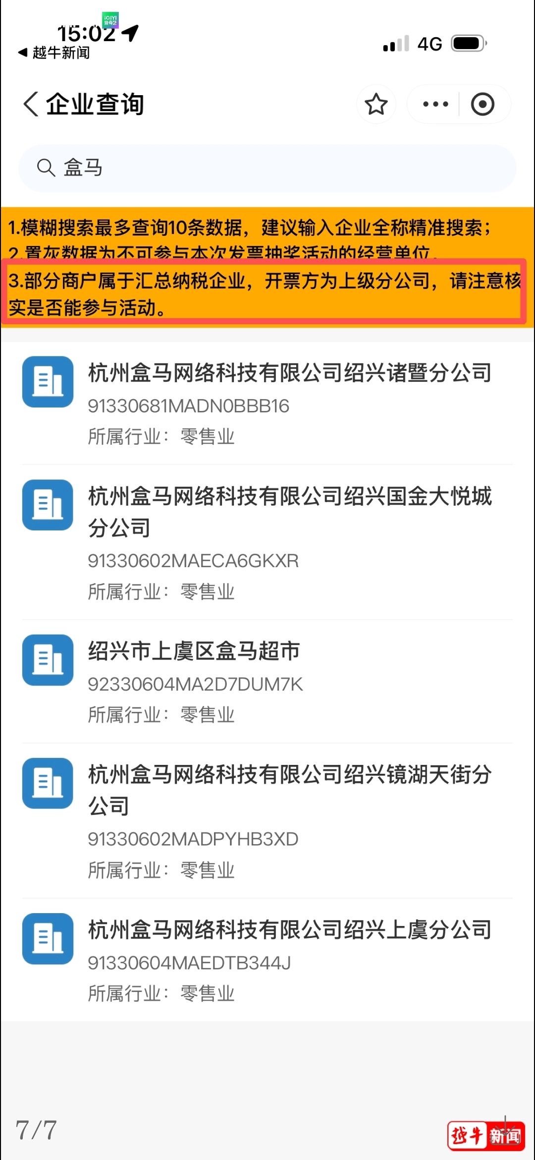 以盒马为例,尽管在活动页面的企业查询板块能检索到相关信息,但实际开票公司均为“杭州盒马网络科技有限公司”。对此,盒马工作人员解释称,绍兴门店是杭州盒马网络科技有限公司的分公司,经浙江省税务部门审批同意,采用汇总纳税模式,因此可使用总机构名义,即杭州盒马统一开票。“后续处理,需待假期结束后进一步回应。”