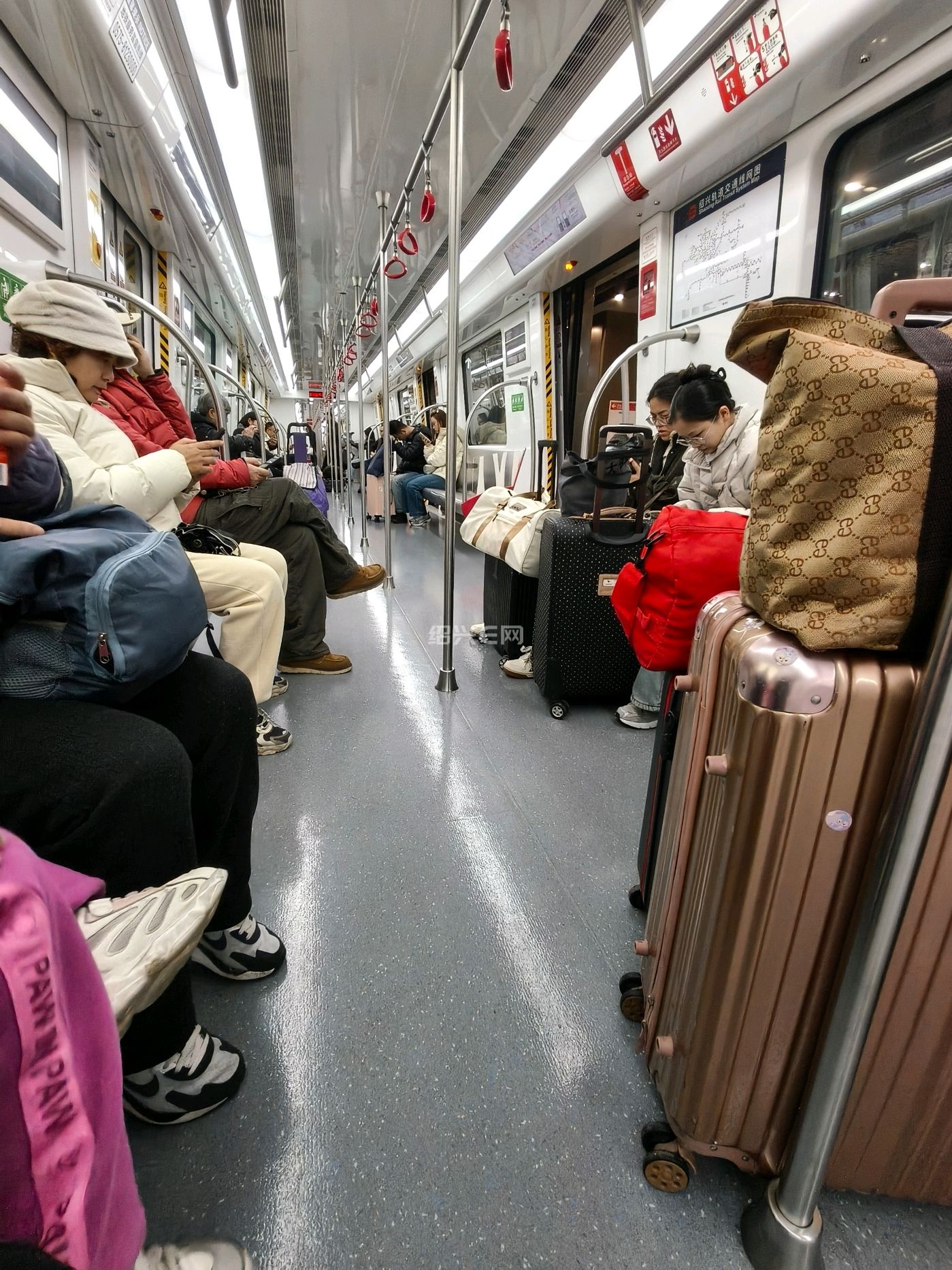 春节长假结束后的首个工作日,地铁上都是大包小包的出门人