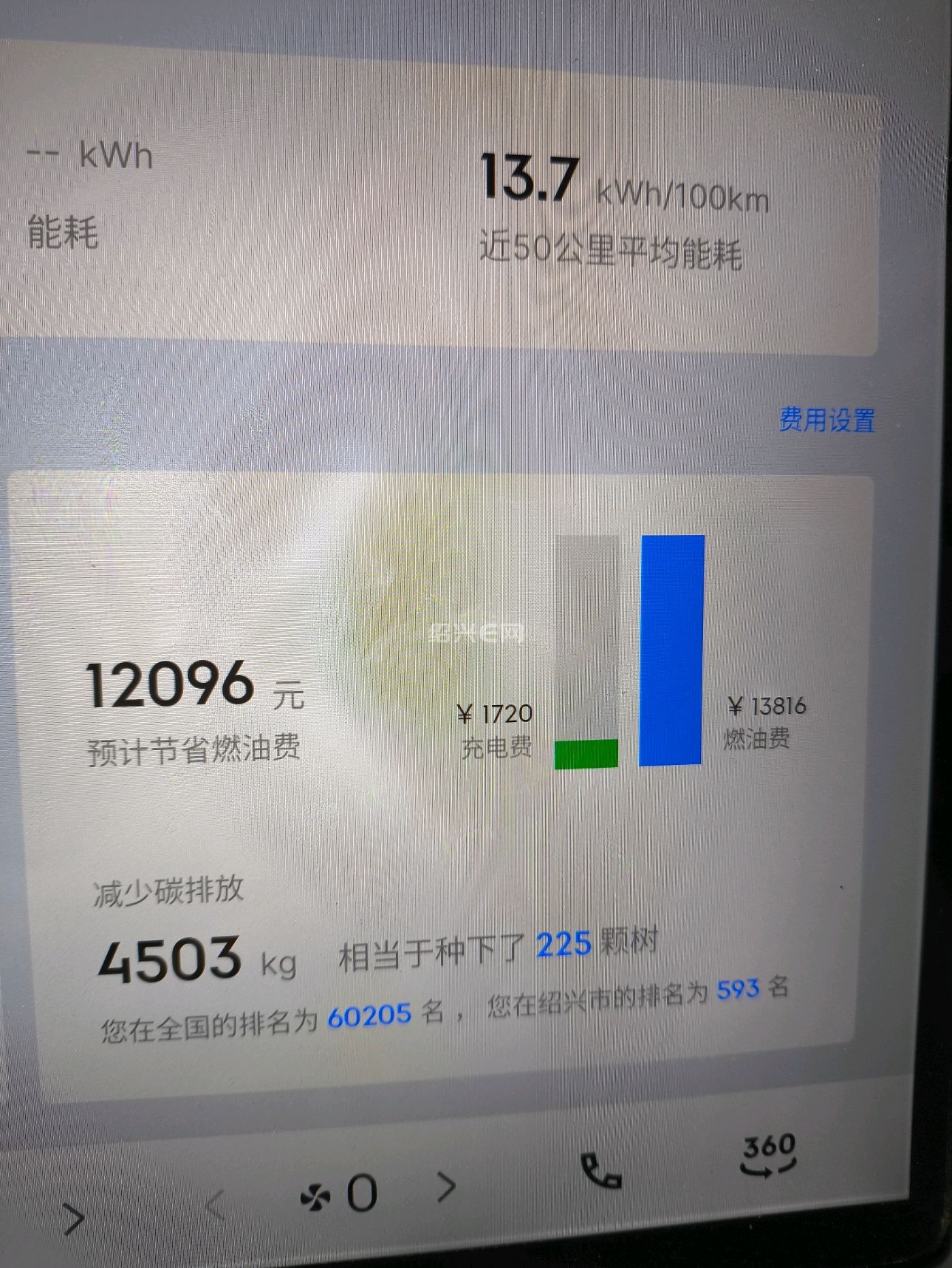 自从换了电车之后,充电花费大概1720元,相当于13,816元燃油费,减少碳排量4503公斤,相当于我为绍兴种下了225棵树。为绍兴碳排量达标作出了重要贡献。我开电车,节能减排,我骄傲。