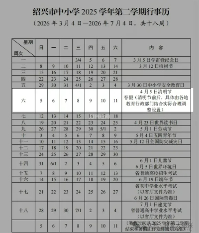 刚刚,绍兴市中小学2025学年第二学期行事历发布。其中提及,这次春假的时间安排,在清明节前后,具体由各地教育行政部门结合实际合理调整设置。